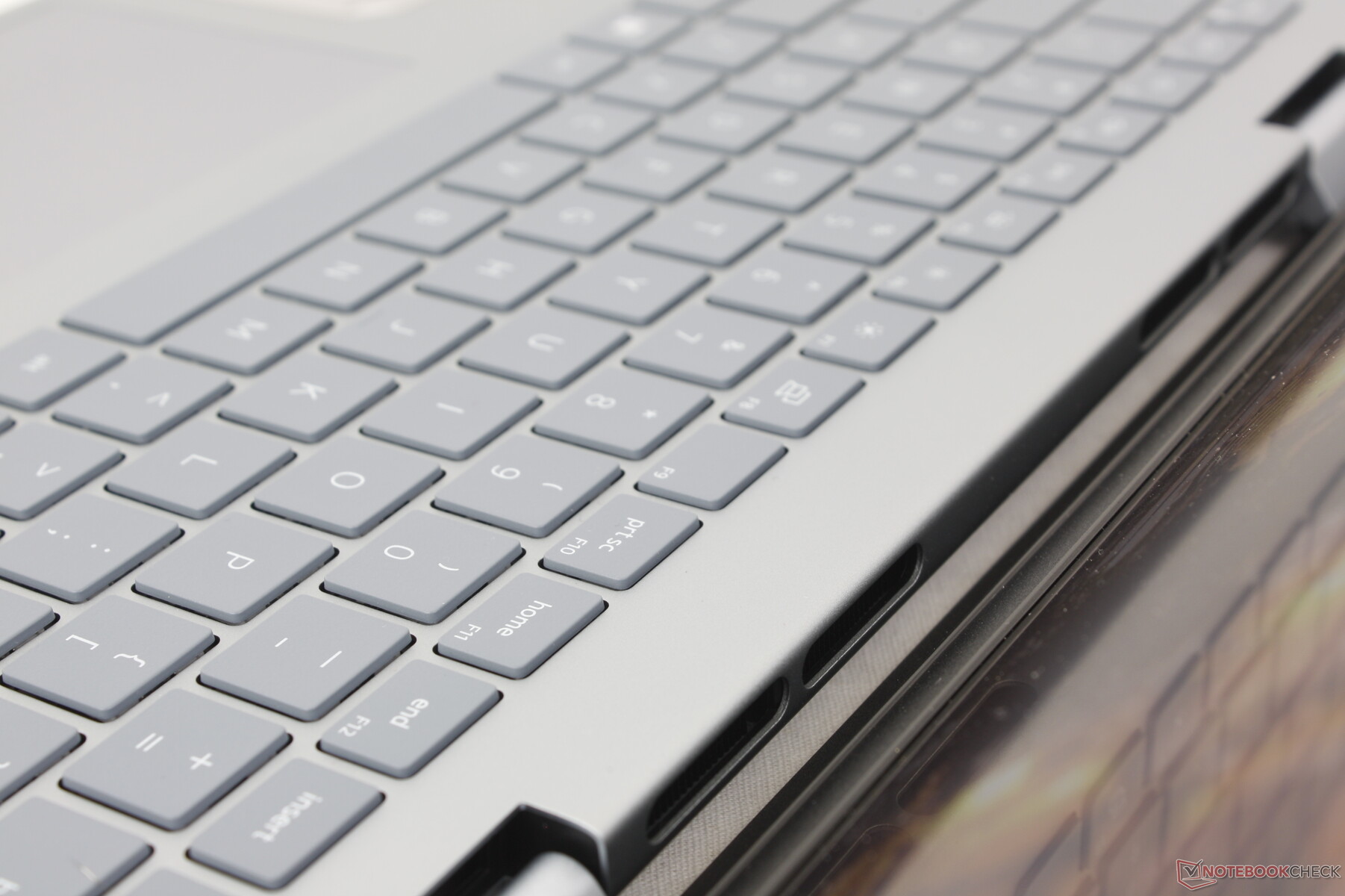 De aan/uit-toets is kleiner op dit model in vergelijking met de toetsenborden op andere Inspiron-modellen zoals de 7420 of 7435 2-in-1 terwijl de rest van het toetsenbord hetzelfde blijft. De feedback op de toetsen is relatief zacht en stil, met uitzondering van de spatiebalk en Enter-toetsen, die duidelijk luider en steviger zijn dan de belangrijkste QWERTY-toetsen.