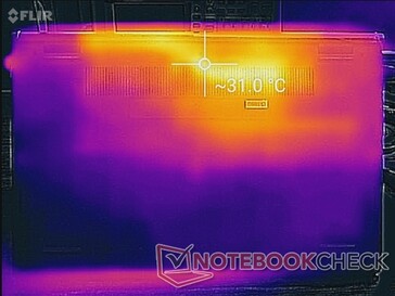 Hete plekken zijn geconcentreerd aan de achterkant van het systeem, waar de processor en zijn koeloplossing zijn geplaatst. Temperaturen kunnen oplopen tot 38 C en 57 C aan de boven- en onderkant van de laptop, respectievelijk, in vergelijking met slechts 31 C en 43 C op de Lenovo IdeaPad 3 15. De palmsteun en het grootste deel van het toetsenbord zullen altijd veel koeler zijn voor comfortabel gebruik, ongeacht de belasting.
