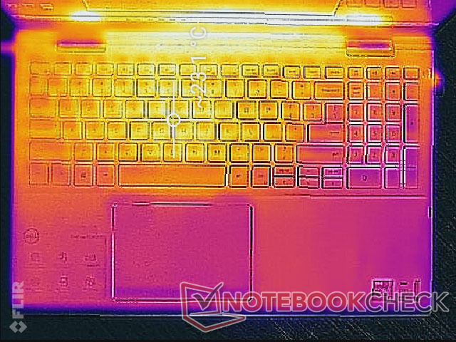De oppervlaktetemperaturen zijn aan de onderzijde veel warmer dan aan de bovenzijde. Bij hoge verwerkingsspanning kan de bodem zo warm zijn als 48 C in vergelijking met slechts 35 C op de hotspot van het toetsenbord. De laptop is daardoor nooit oncomfortabel om op te typen, maar zorg ervoor dat de ventilatieroosters eronder niet worden geblokkeerd, vooral omdat de kerntemperaturen erg warm kunnen zijn, zoals onze Stress Test sectie hieronder zal illustreren.
