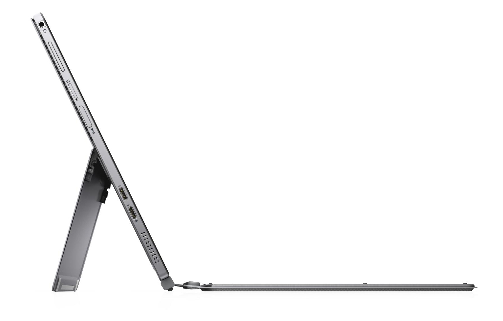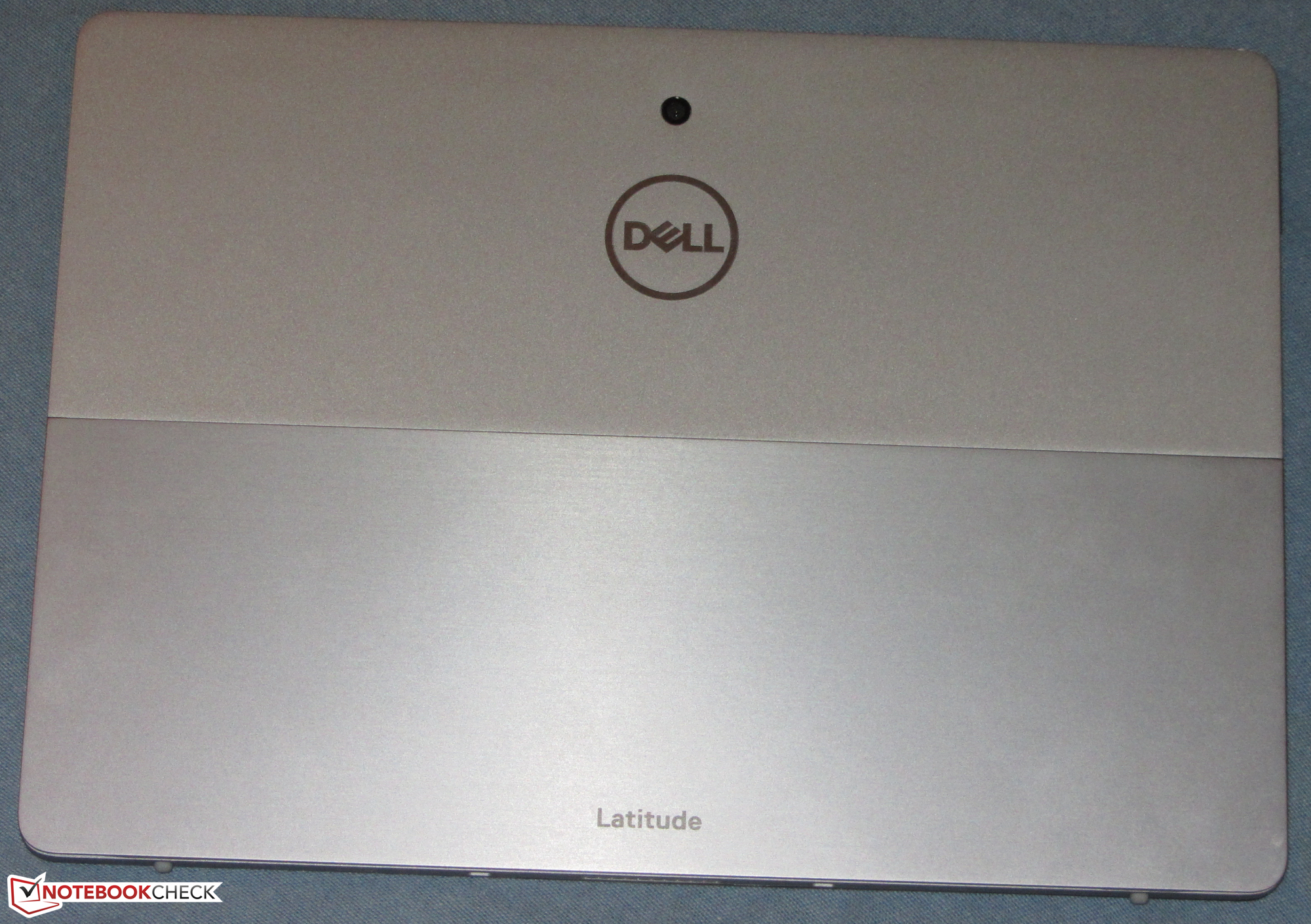 Dell heeft voor de Latitude 12 gekozen voor een vrij stijlvolle zilvergrijze metalen behuizing die een zekere gelijkenis met het chassis van de Surface Pro 7 niet van zich af kan schudden. De standaard van de tablet unit kan in oneindig veel standen worden versteld en maakt een maximale openingshoek van ongeveer 150 tot 160 graden mogelijk. De strakke scharnieren voorkomen dat de standaard in elkaar zakt.