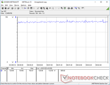 De prestaties-per-watt liggen aanzienlijk hoger dan die van de meeste andere werkstations, omdat onze Precision een nieuwere generatie Ada Lovelace GPU gebruikt. Het uitvoeren van Witcher 3zou bijvoorbeeld slechts 134 W verbruiken op ons systeem vergeleken met 159 W en 189 W op de Precision 7670 Prestaties en HP ZBook Fury 16 G9, respectievelijk, hoewel onze RTX 5000 GPU beter zou presteren dan hun RTX A5500 GPU's, zoals hierboven vermeld.