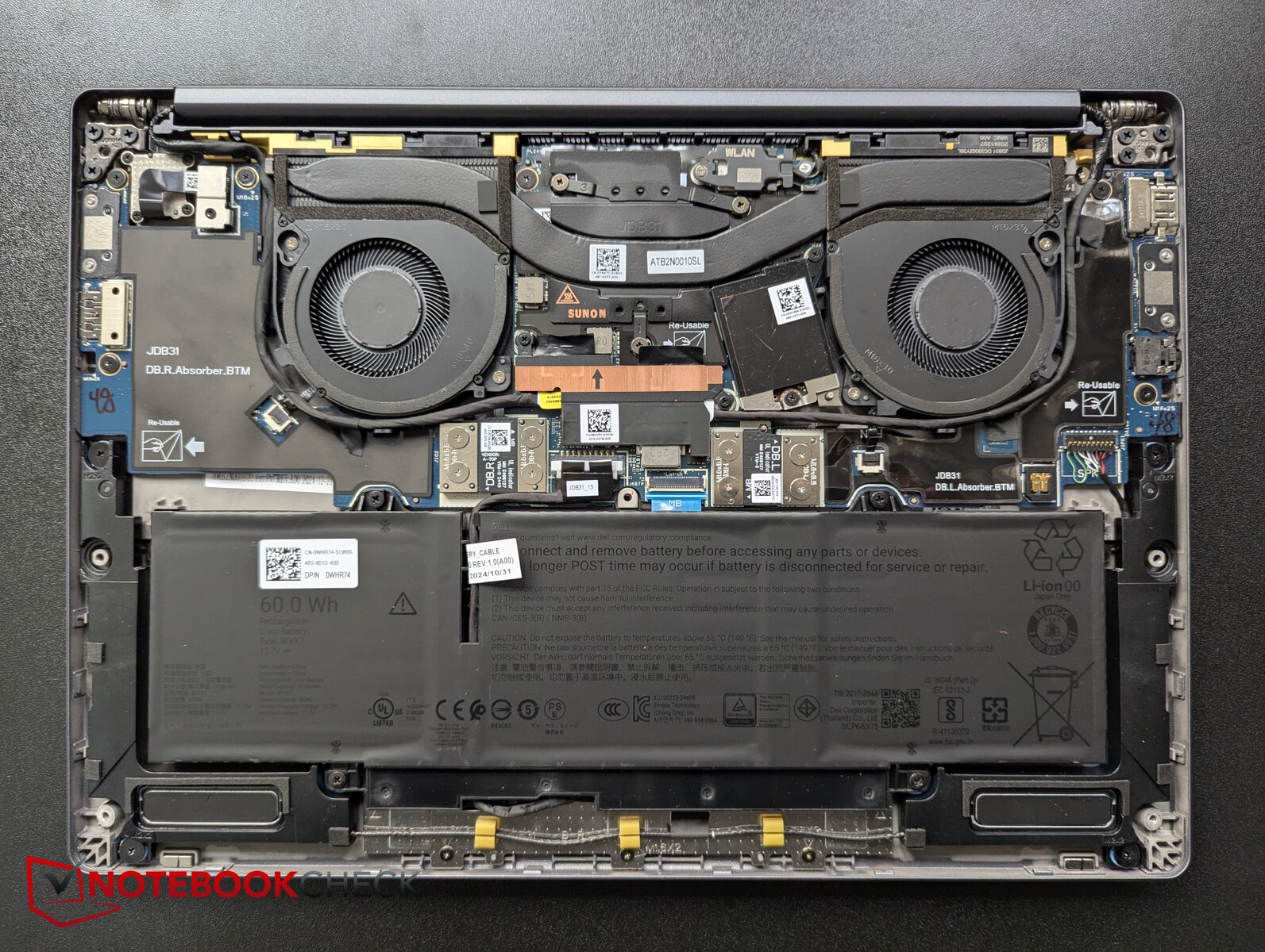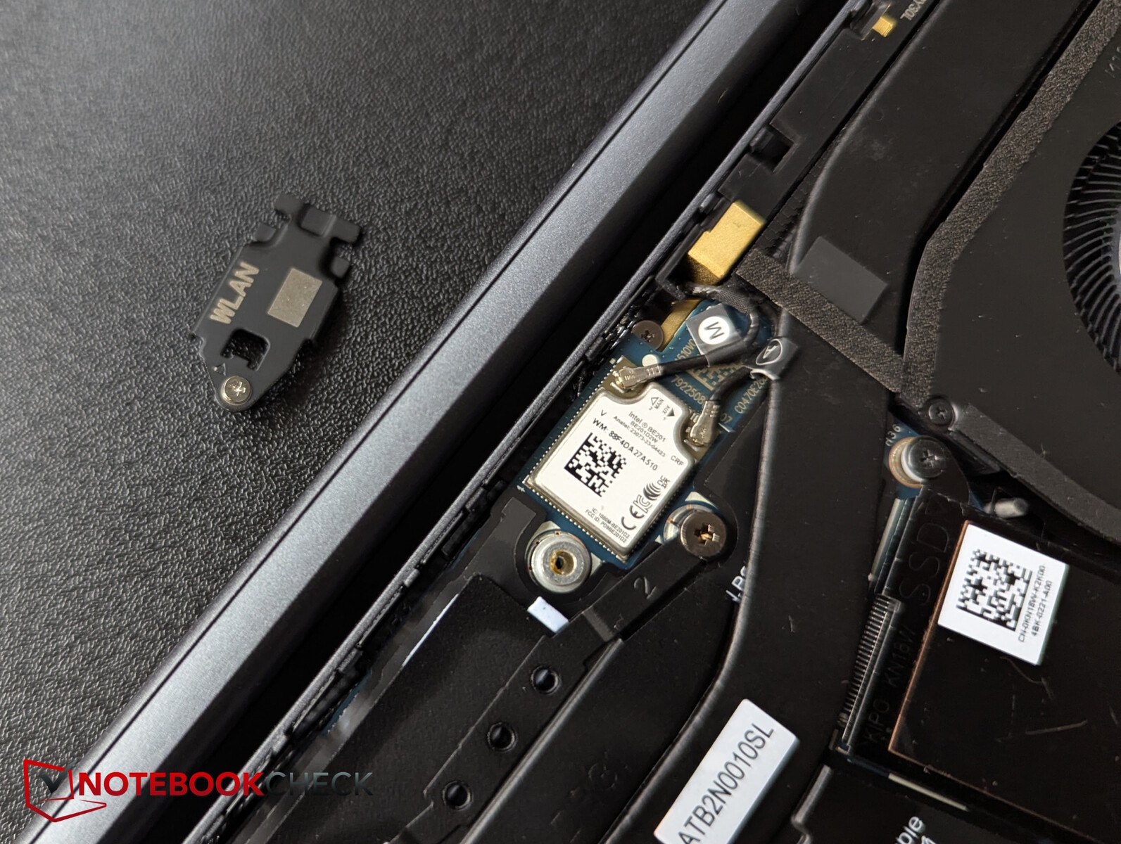 De zakelijke laptop is relatief eenvoudig te openen met de kruiskopschroeven die nog in de bodemplaat zitten. Het RAM-geheugen en de Wi-Fi-module zijn echter permanent binnenin geïnstalleerd, en de SSD heeft alleen het kleine M.2 2230-formaat en mist een tweede sleuf.