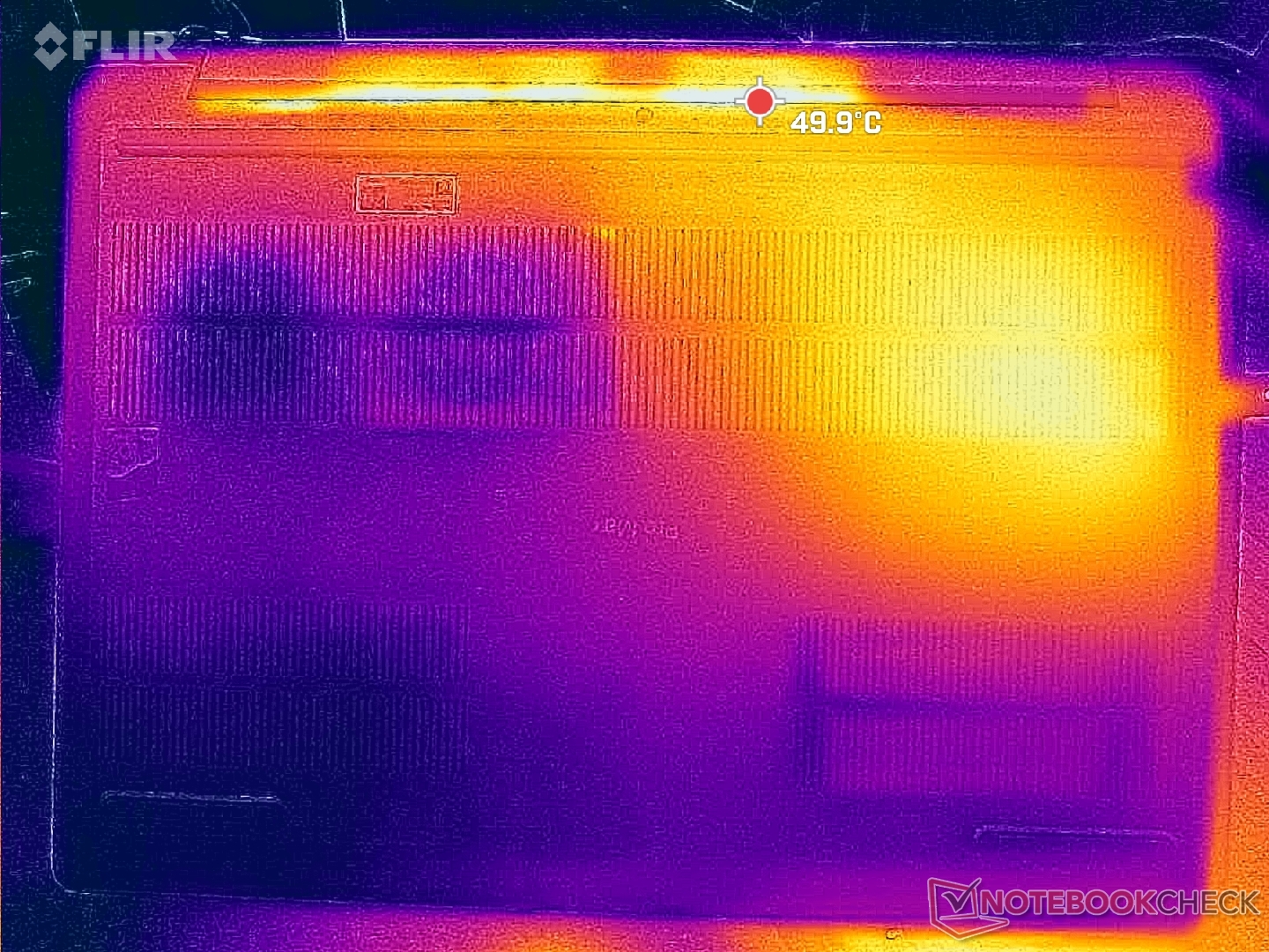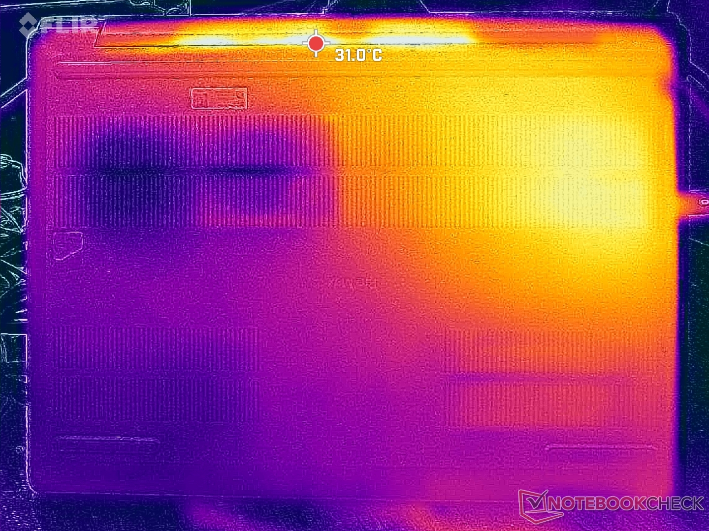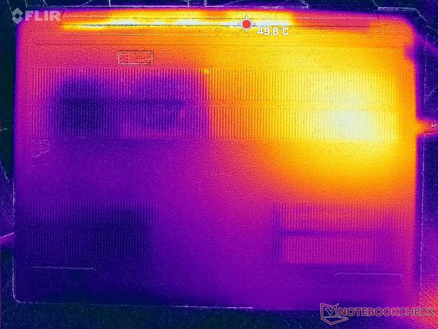 De oppervlaktetemperaturen zijn bijna altijd warm, ongeacht de belasting op het scherm, waarschijnlijk als gevolg van de lethargische ventilatoren en krachtige onderdelen. De linkerhelft van de behuizing wordt merkbaar warmer dan de rechterhelft door de asymmetrische koeloplossing.