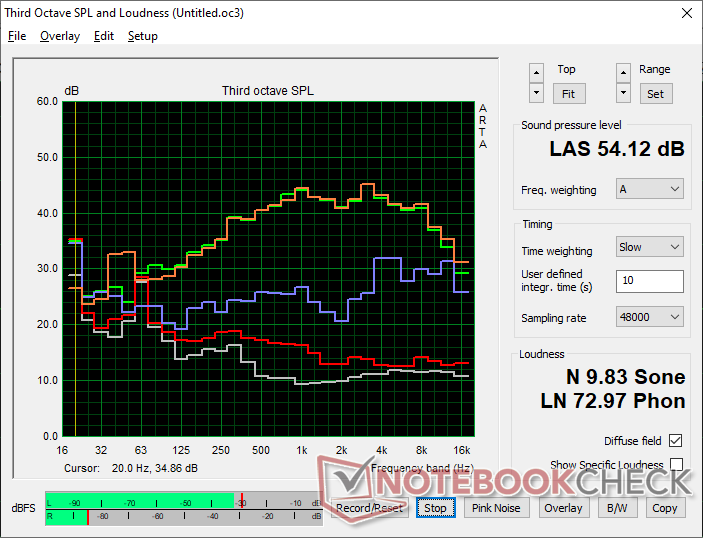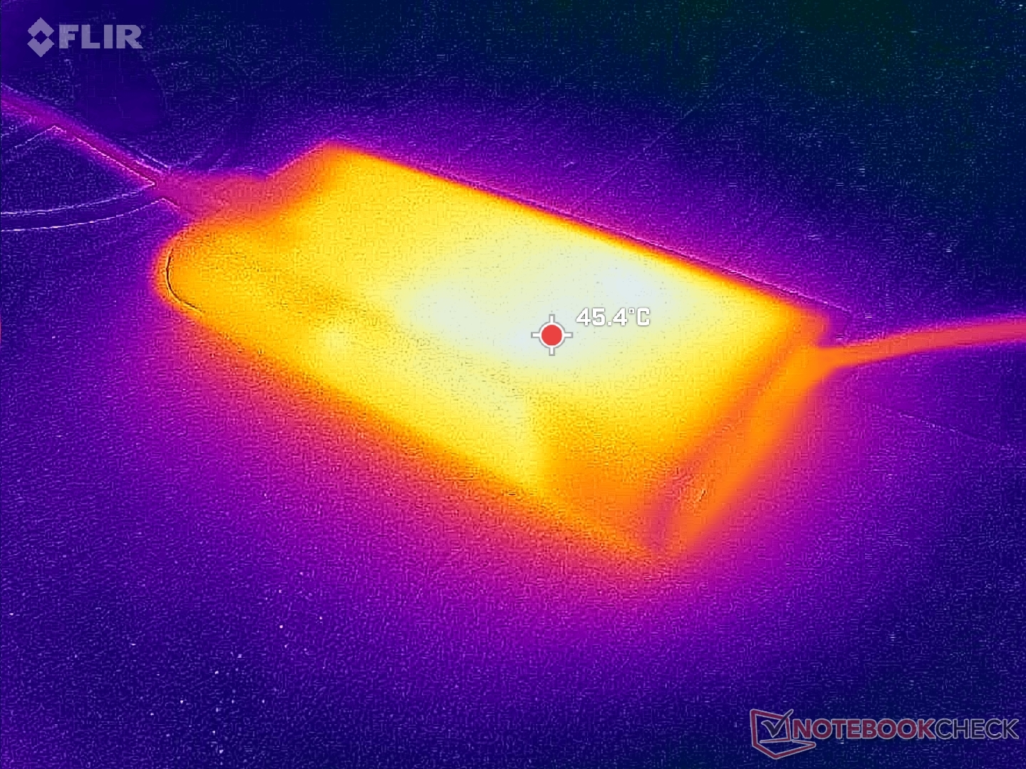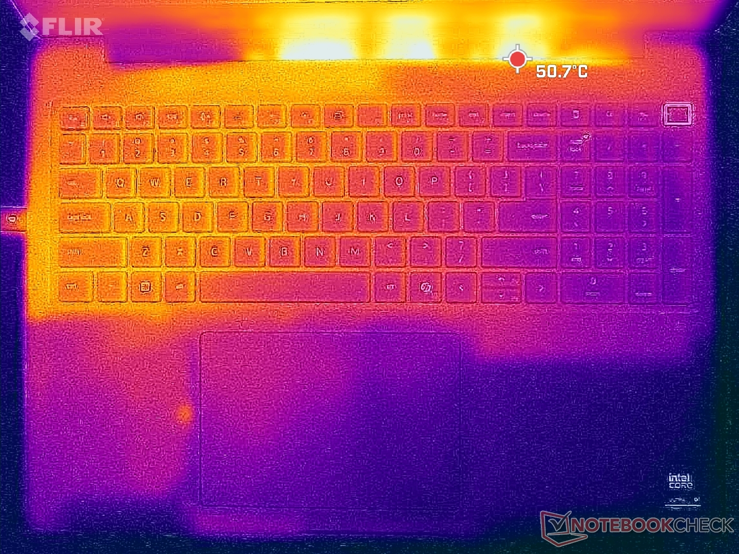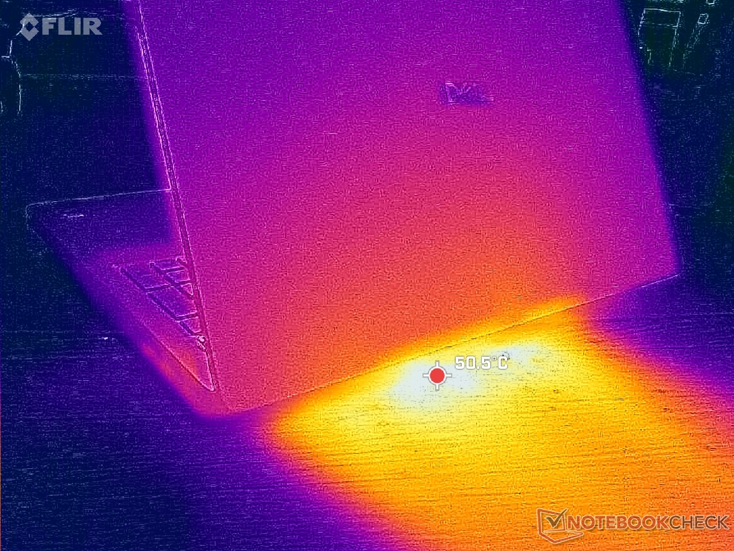 De oppervlaktetemperaturen zijn bijna altijd warm, ongeacht de belasting op het scherm, waarschijnlijk als gevolg van de lethargische ventilatoren en krachtige onderdelen. De linkerhelft van de behuizing wordt merkbaar warmer dan de rechterhelft door de asymmetrische koeloplossing.