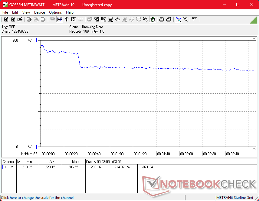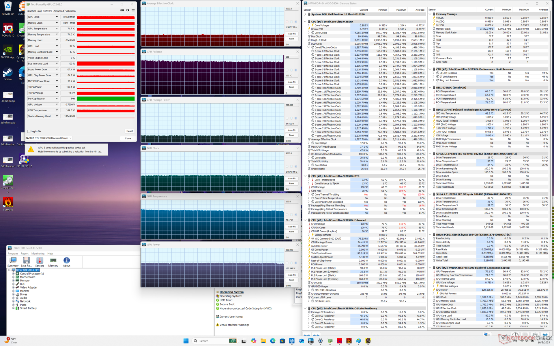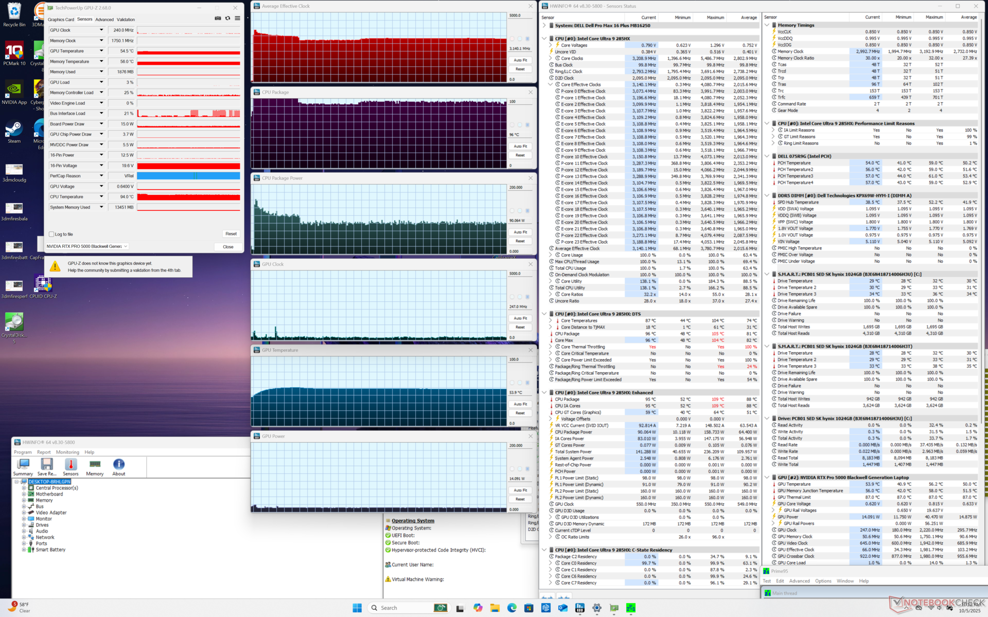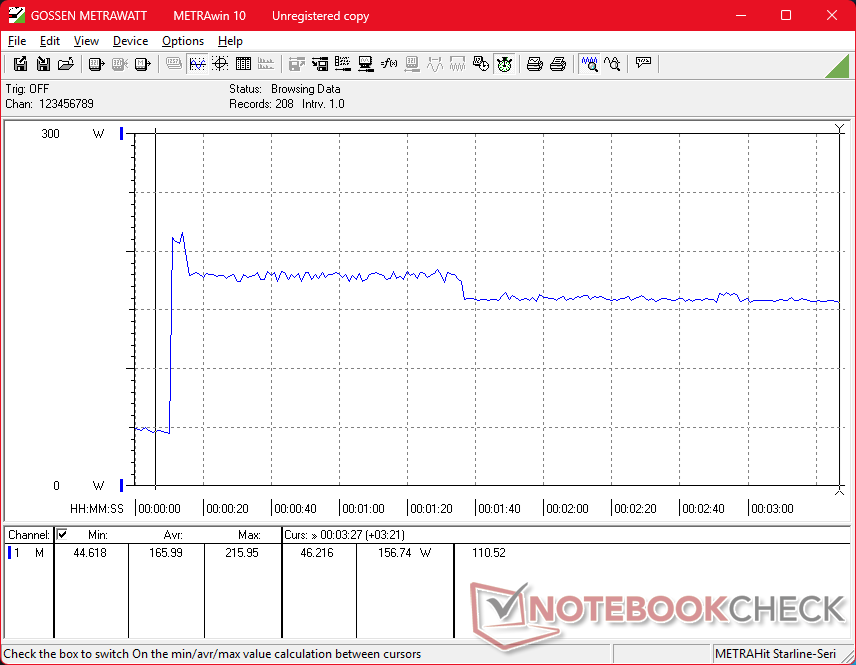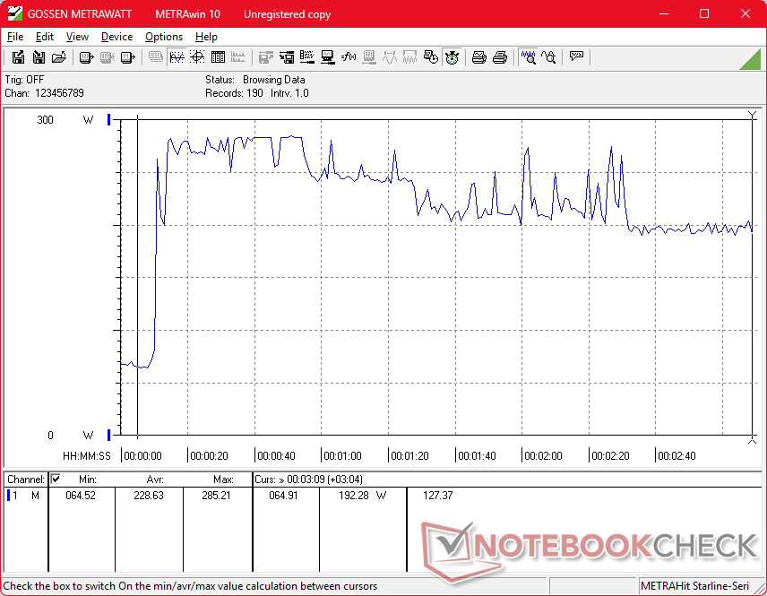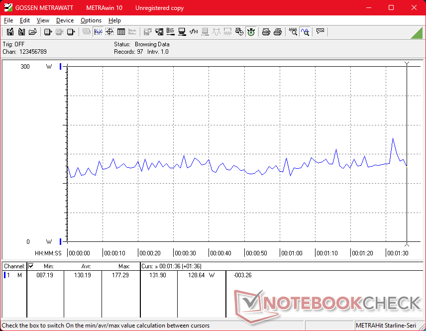 De nadelen zijn over het algemeen klein. Het stroomverbruik is nu hoger dan voorheen, namelijk 280 W in vergelijking met 240 W of minder op de Precision 7680. Hoewel de Pro Max 16 Plus dus zeker krachtiger is, is hij ook veeleisender voor de koeling en gaat de batterij over het algemeen minder lang mee. Met name de CPU-temperatuur kan oplopen tot 95 C tot 105 C wanneer deze onder druk staat, wat gevolgen heeft voor de Turbo Boost-prestaties van het systeem. Ondertussen heeft de GPU de neiging om zich te stabiliseren op 125 W, ook al is deze berekend op maximaal 175 W. Het is daarom waarschijnlijk dat dezelfde CPU en GPU sneller werken op dikkere of grotere vormfactoren zoals de 18-inch Pro Max 18 Plus. Het Pro Max 16 Plus systeem is niettemin een van de snelste en meest praktische werkstations die verkrijgbaar zijn, ondanks de beperkingen van de koeloplossing.