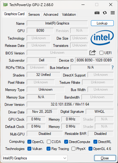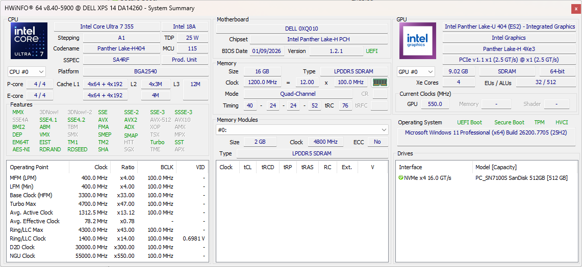| Dell XPS 14 Core Ultra 7 355 Intel Core Ultra 7 355 ⎘ Intel Graphics 4 Xe3 Panther Lake iGPU ⎘ 16 GB Geheugen, 512 GB SSD | Amazon: Catalogusprijs: 1600 USD | 1.5 kg | 15.2 mm | 14.00" 1920x1200 162 PPI IPS | |