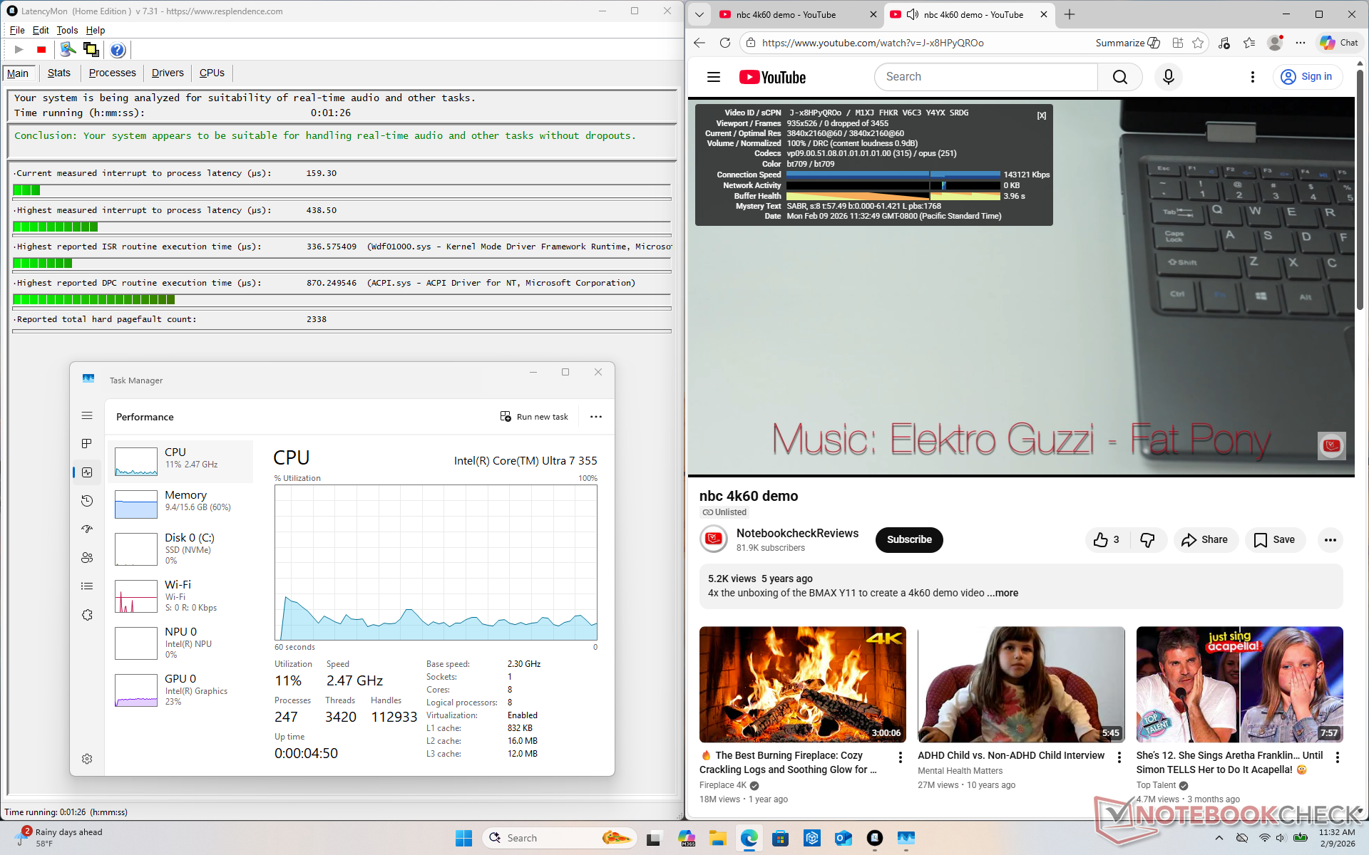 De Core Ultra 7 355 verliest veel van wat de Panther Lake H-serie in de eerste plaats zo speciaal maakt. In het bijzonder zijn zowel de prestaties als de prestaties-per-watt dichter bij Lunar Lake-V of zelfs nog slechter als we rekening houden met hun geïntegreerde grafische prestaties. Terwijl het vlaggenschip Core Ultra X7 358H een enorme sprong voorwaarts is voor de serie, kan de middenklasse Core Ultra 7 355 aanvoelen als een rebranded Core Ultra 7 255U in veel opzichten. Het systeem loopt niet merkbaar koeler of langer dan de snellere Core Ultra X7 optie, ondanks hun prestatieverschillen.