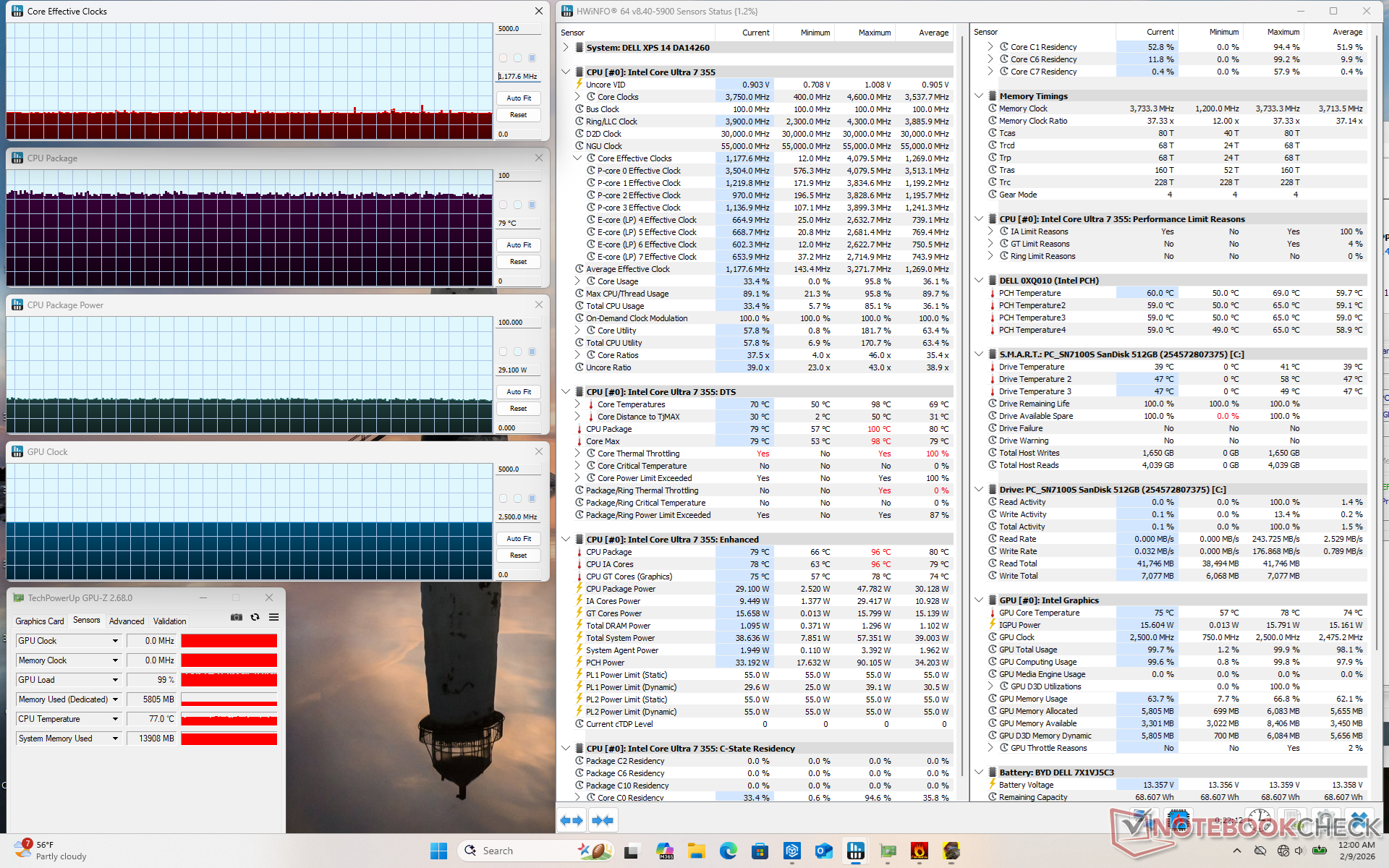 Helaas erft de Core Ultra 7 355 niet veel van de prestatie-per-watt voordelen van de Core Ultra X7-serie. Als u bijvoorbeeld Prime95 uitvoert op een externe monitor, verbruikt het systeem slechts 13 procent minder dan de Core Ultra X7 XPS 14, terwijl de prestaties 40 procent langzamer zijn. Op dezelfde manier zou het draaien van Cyberpunk 2077 of FurMark slechts 7 tot 15 procent minder energie vragen, terwijl de grafische prestaties met maar liefst 60 procent afnemen.