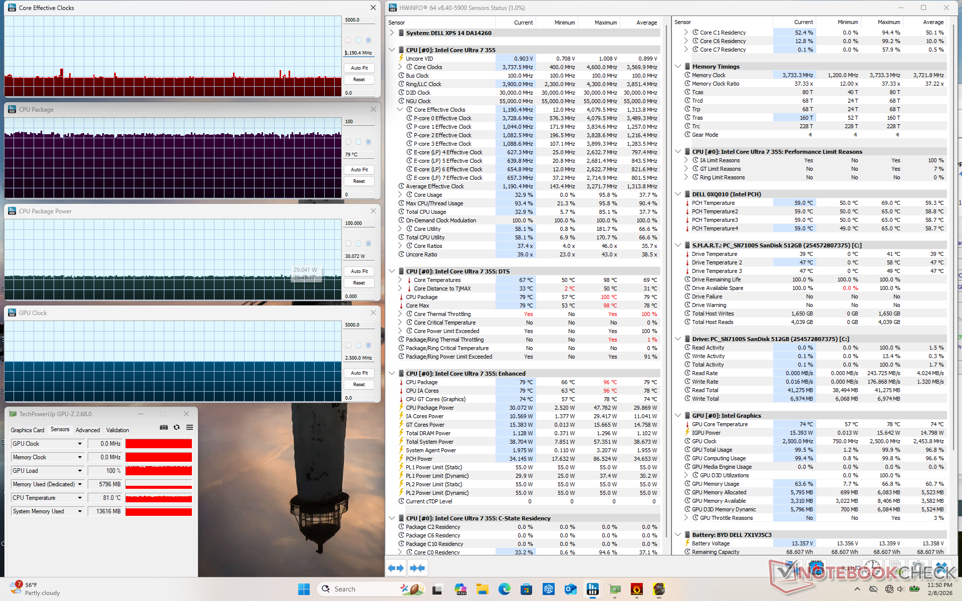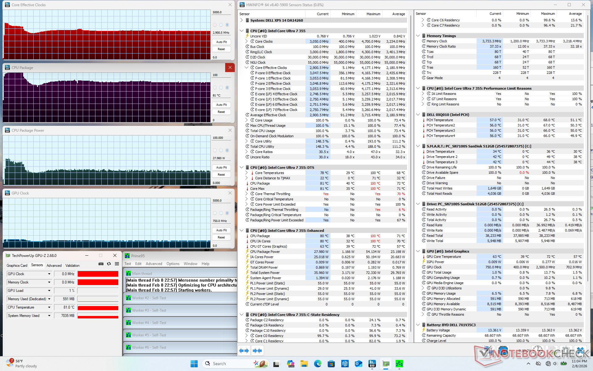 Tijdens het uitvoeren van Prime95 stress, steeg de CPU naar 3,7 GHz en 54 W gedurende slechts enkele seconden bij 100 C. Daarna stabiliseerde hij op 2,9 GHz, 28 W en 81 C om het beperkte Turbo Boost-potentieel weer te geven. De kerntemperatuur zou bij veeleisende belastingen een plateau bereiken van minder dan 80 C, wat iets koeler is dan wat we hebben gemeten bij de Arrow Lake-H van vorig jaar Dell 14 Premium.