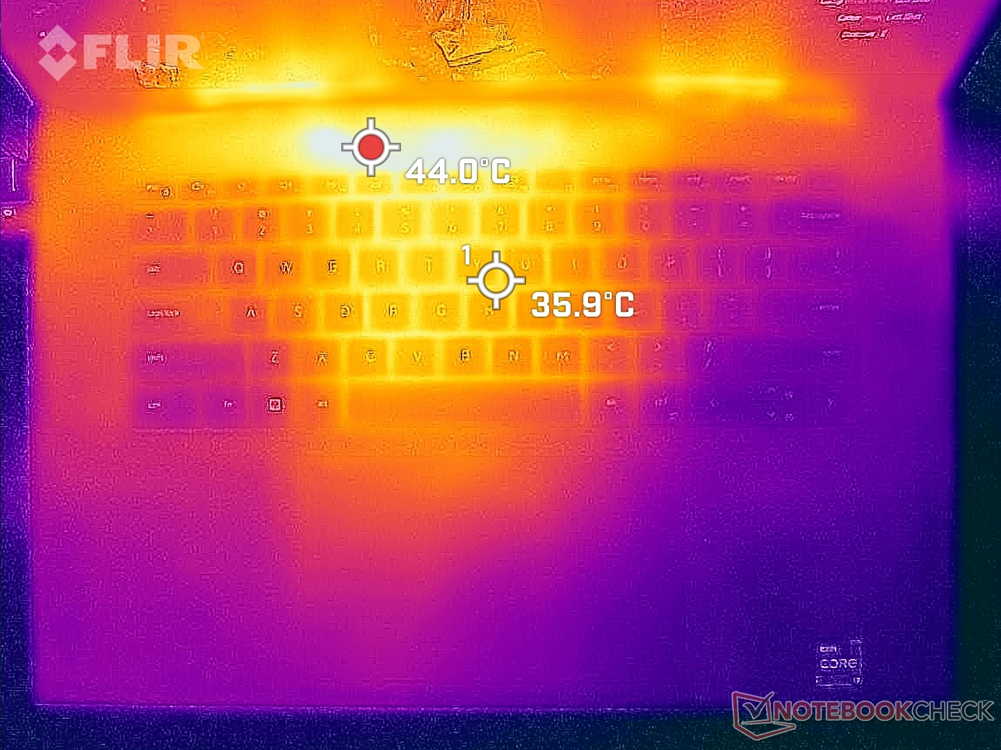 De temperaturen van de Surface zijn koeler dan verwacht in vergelijking met andere laptops met vergelijkbare Core H-serie CPU's en GeForce RTX GPU's. De concurrerendeMSI Creator Z17zou bijvoorbeeld hete plekken hebben van wel 60+ C, terwijl onze Dell slechts 43 C zou hebben bij vergelijkbare zware belastingen. De lagere oppervlaktetemperaturen op de Dell kunnen worden toegeschreven aan de dampkamer-koeler, GORE thermische isolatie, en over het algemeen een lager energieverbruik.