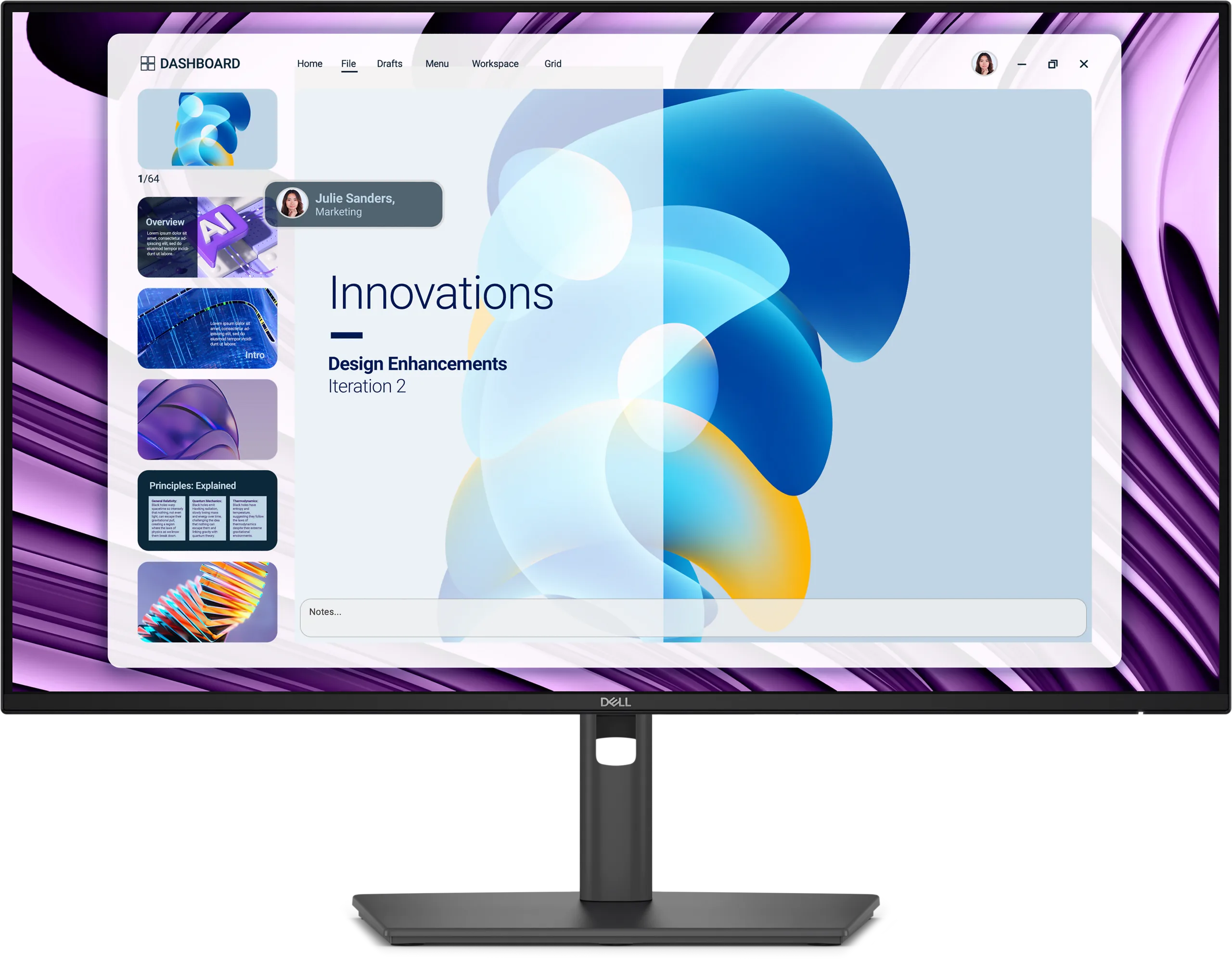 De monitor heeft een resolutie van 1920 × 1080, een beeldverhouding van 16:9, een verversingssnelheid van 120 Hz en een responstijd van 8 ms. Dell zegt dat het scherm een harde antireflectielaag heeft en dat de monitor naar voren of achteren kan worden gekanteld, tot 45° zijwaarts kan worden gedraaid en zelfs 90° van horizontaal naar verticaal kan worden gedraaid. Gebruikers kunnen ook de hoogte aanpassen tot 150 mm.