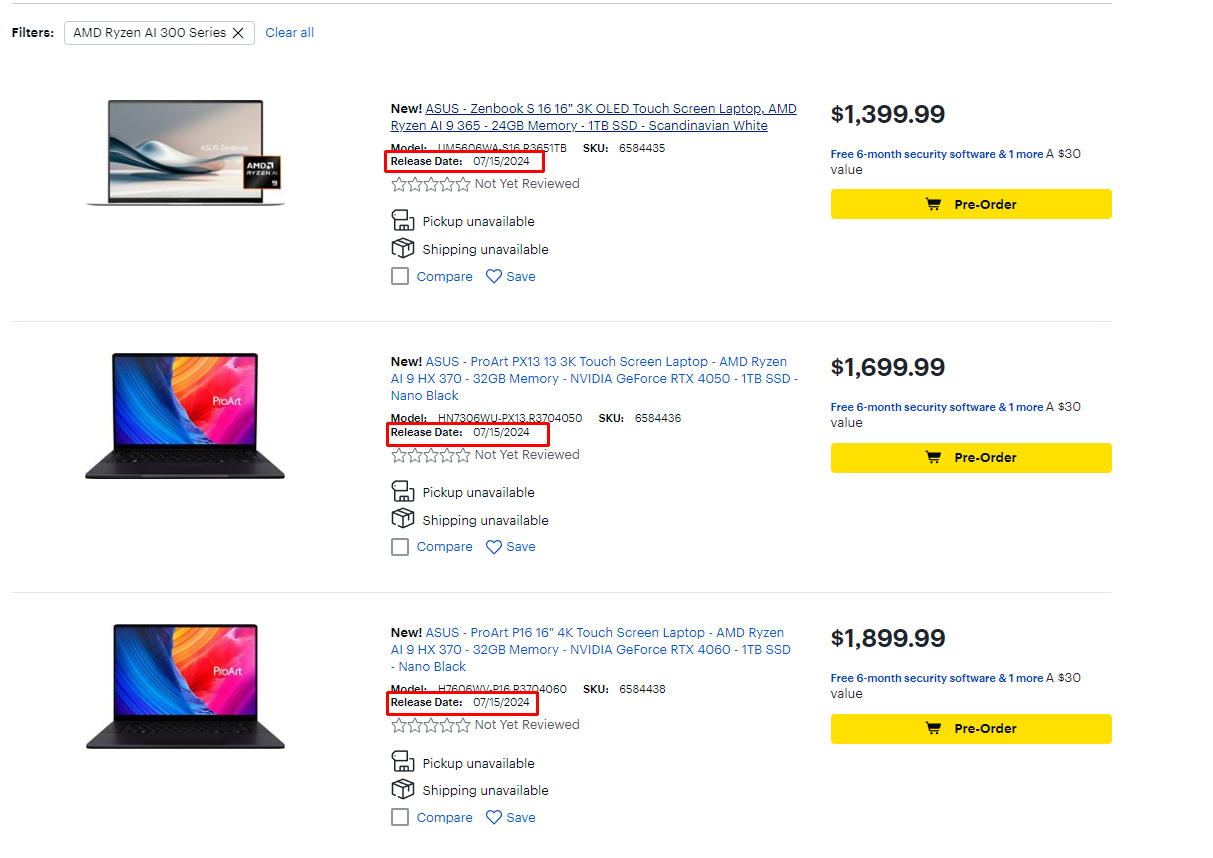 Nu we het er toch over hebben, de lancering van laptops met de AMD Strix Point-laptopprocessors zou wel eens om de hoek kunnen komen kijken. Tenminste, dat is wat de aanbiedingen van de detailhandelaren suggereren. Meer specifiek, volgens de aanbiedingen op Best Buy, is de AMD Ryzen AI 300 laptops op 15 juli verkrijgbaar zijn.