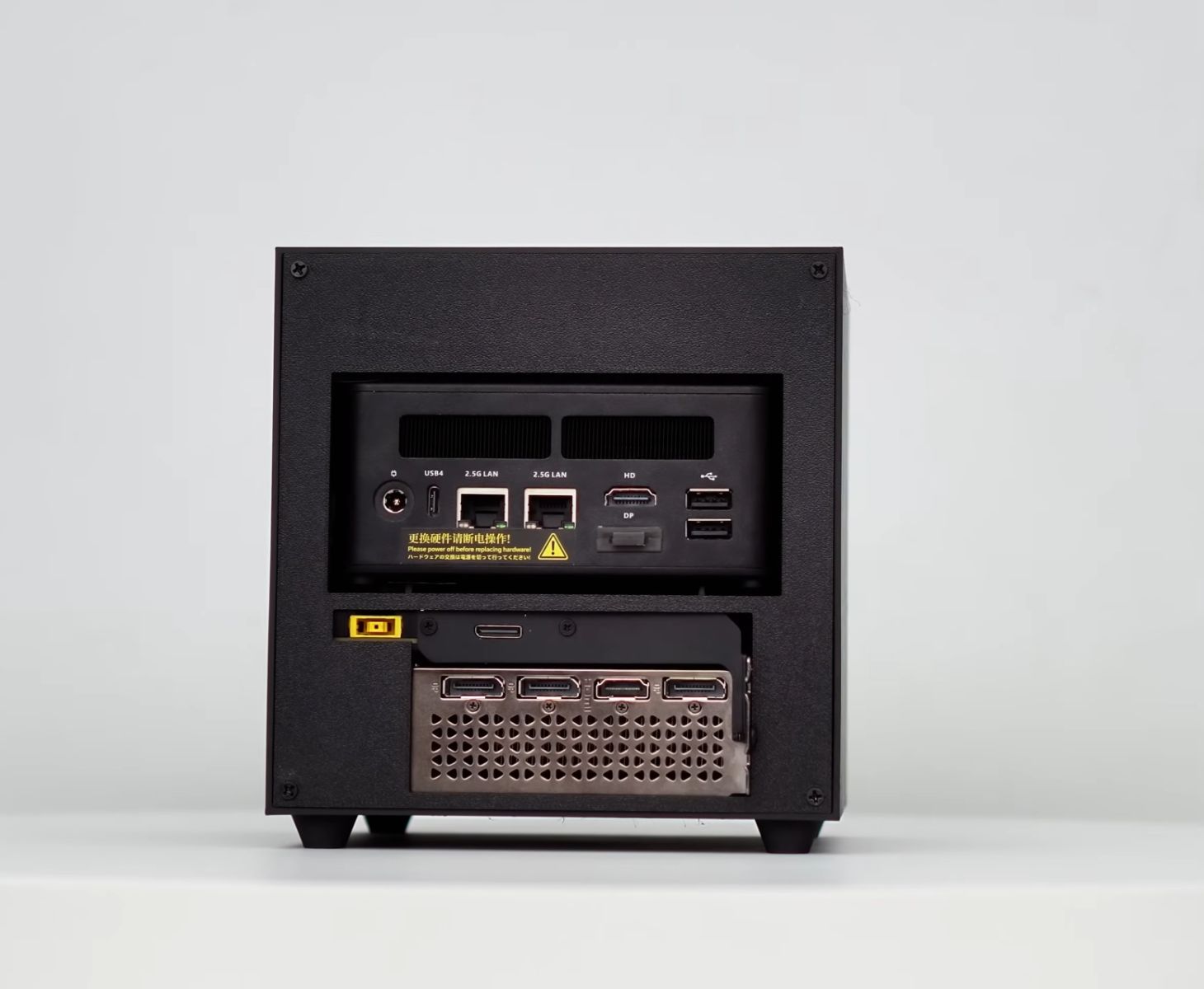 De koeling wordt verzorgd door een grote 120 mm ventilator aan de bovenkant. Hoewel de ventilator wordt aangedreven via USB in plaats van volledige PWM-regeling, merkt de maker op dat hij stil blijft en de temperatuur onder controle houdt tijdens lange gamesessies. Het stroom- en kabelbeheer is ook minimaal gehouden, waarbij de eGPU de stroomstatus direct synchroniseert met de mini-pc.