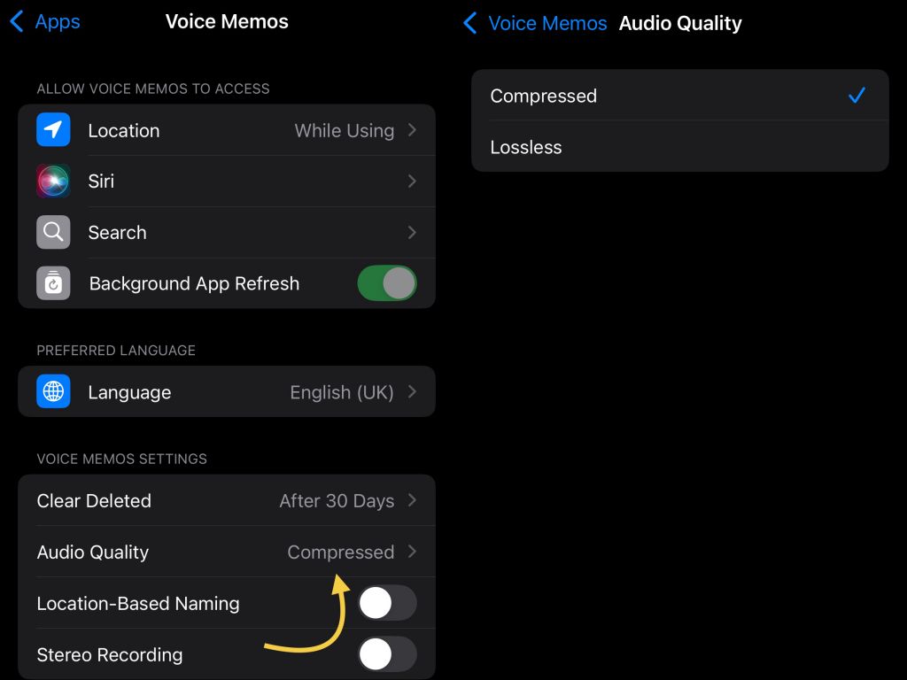 Als u naar uw iPhone Instellingen > Spraakmemo's > Audio gaat, vindt u twee opties voor kwaliteit - gecomprimeerd en verliesvrij.