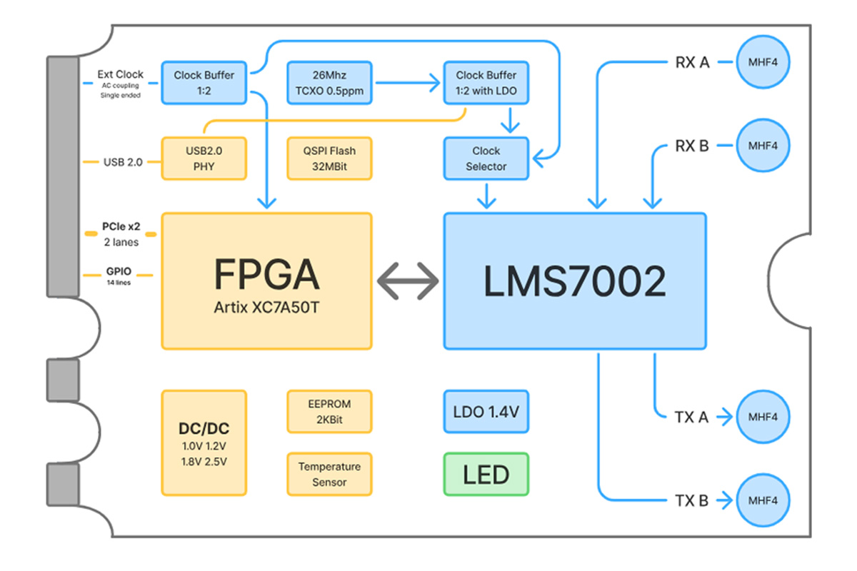 In de kern is de xSDR gebaseerd op de Lime Microsystems LMS7002M RF transceiver, gekoppeld aan een AMD Artix-7 XC7A50T FPGA. Deze combinatie bestrijkt een afstembereik van 30 MHz tot 3,8 GHz. De SDR ondersteunt bemonsteringssnelheden van 0,1 MSPS tot 122,88 MSPS in SISO-modus en meer dan 80 MSPS in MIMO-modus, met kanaalbandbreedtes van 0,5 MHz tot 90 MHz. Vier MHF4 antenneconnectoren bieden toegang tot de twee RX en twee TX kanalen.