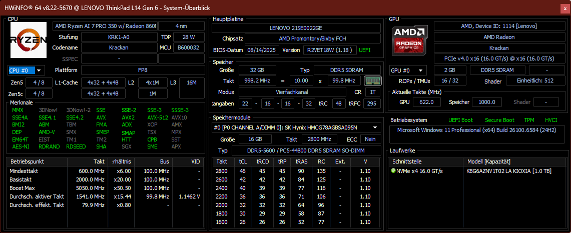 | Lenovo ThinkPad L14 Gen 6 21SE0022GE Ryzen AI 7 PRO 350, Radeon 860M, Kioxia BG6 KBG6AZNV1T02, IPS LED, 1920x1200, 14" | Lenovo ThinkPad L14 G5 21L50014GE R5 7535U, Radeon 660M, Lenovo UMIS AM6A0 RPETJ512MKP1QDQ, IPS LED, 1920x1200, 14" | Asus ExpertBook PM3406 Ryzen AI 7 350, Radeon 860M, Western Digital PC SN5000S SDEQNSJ-512G-1002, IPS, 1920x1200, 14" | Dell Pro 14 Plus PB14255 GH77W Ryzen AI 7 PRO 350, Radeon 860M, Micron 2500 1TB MTFDKBA1T0QGN, IPS LED, 1920x1200, 14" | HP EliteBook 6 G1q 14 SD X Plus X1P-42-100, Adreno X1-45 1.7 TFLOPS, Samsung PM9A1 MZVL2512HCJQ, IPS, 1920x1200, 14" | Lenovo ThinkPad E14 Gen 7 21U2002QGE Core Ultra 5 228V, Arc 130V, Samsung PM9C1b MZVL81T0HFLB-00BH1, IPS, 2880x1800, 14" | Gemiddeld AMD Radeon 860M | Gemiddelde van klas Office | |