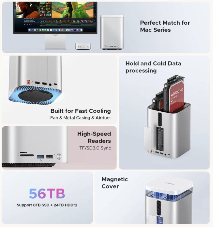 Tot slot heeft Orico ook de MiniTower aangekondigd, die een beetje lijkt op een AirPort Extreme. Volgens Orico ondersteunt de MiniTower tot 56 TB aan opslag via twee SATA 3.0-schijven en een NVMe M.2-sleuf. Bovendien heeft de MiniTower een RAID-knop, plus vier USB Type-A poorten en een paar SD-kaartsleuven.