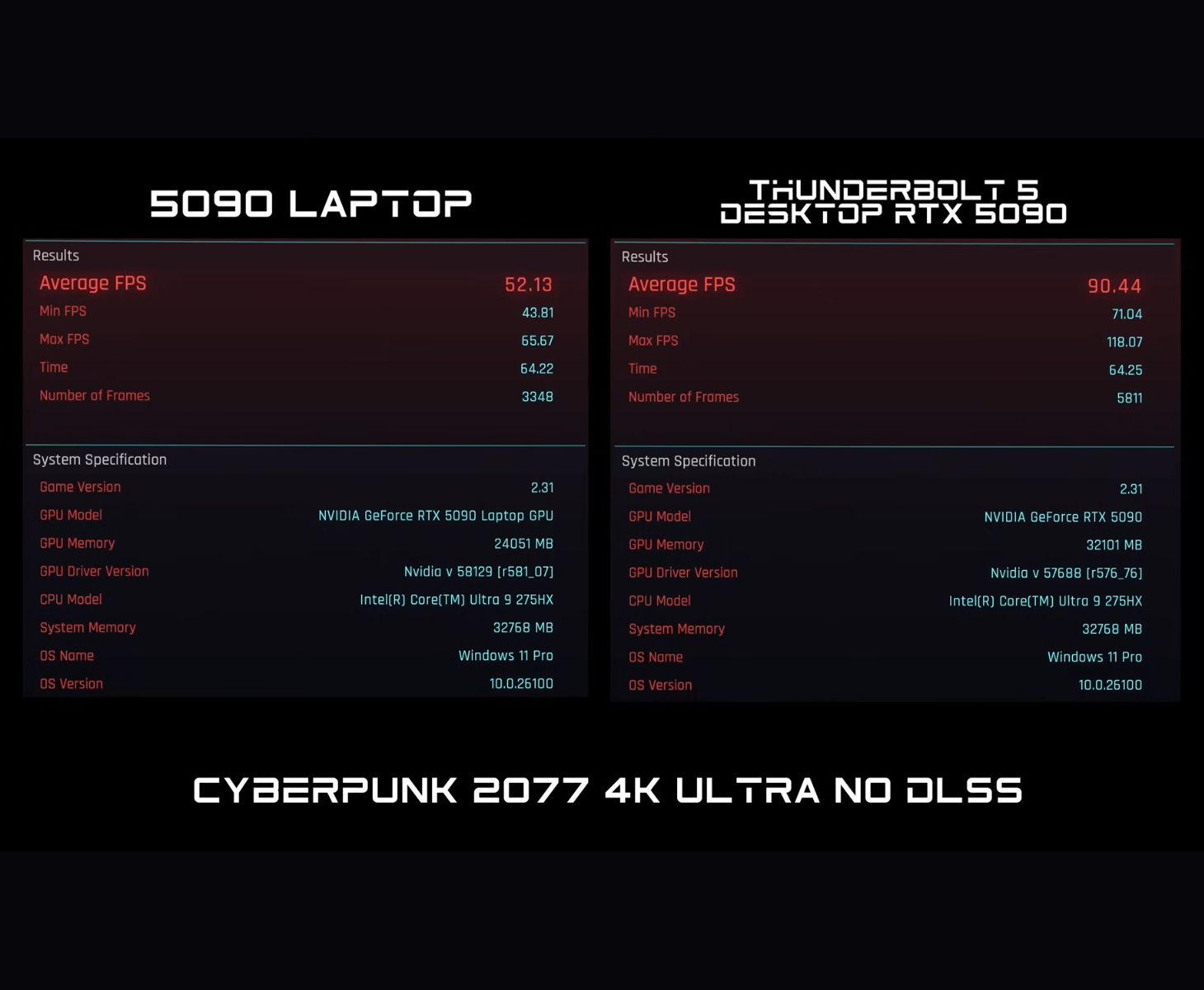 Tijdens het testen van Cyberpunk 2077 krijgen we het grootste verschil tussen beide opstellingen te zien. Bij 4K Ultra zonder DLSS scoorde de RTX 5090 laptop GPU 52 FPS. Ondertussen scoorde de RTX 5090 via het eGPU dock 90 FPS. Het TGP-verschil was ook aanzienlijk, aangezien de laptop RTX 5090 ongeveer 170 W verbruikte, terwijl het Razer eGPU dock ongeveer 460 W aan stroom verbruikte.