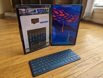 De Yoga Book 9i 2-in-1 Dual Screen, geïntroduceerd op CES 2023, is een riskant maar intrigerend convertibel concept waarbij zowel het B- als het C-gezicht identieke 13,3-inch OLED-touchscreens zijn. Het toetsenbord is gedegradeerd tot een externe Bluetooth-add-on en het clickpad is nu een virtuele op het secundaire touchscreen. Deze aanpak verschilt van de Asus ZenScreen met een veel kleiner secundair touchscreen.