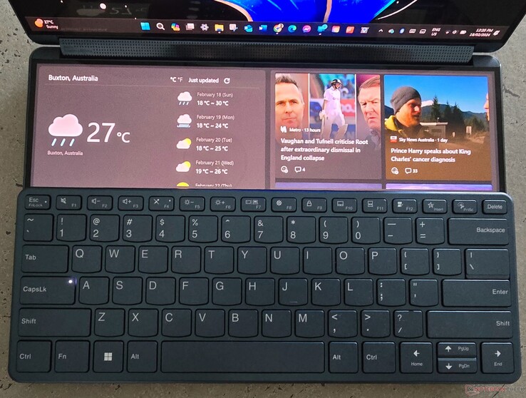 Het toetsenbord is ook niet meer dan dat - een toetsenbord, zonder trackpad dat magnetisch in één van twee posities aan het onderste scherm wordt bevestigd. In de standaardpositie, die zich aan de "voorkant" of "bovenkant" van het onderste scherm bevindt, wordt eronder een virtueel trackpad onthuld. In de onderste positie verschijnen widgets links en rechts in een half gesplitst schermmodel