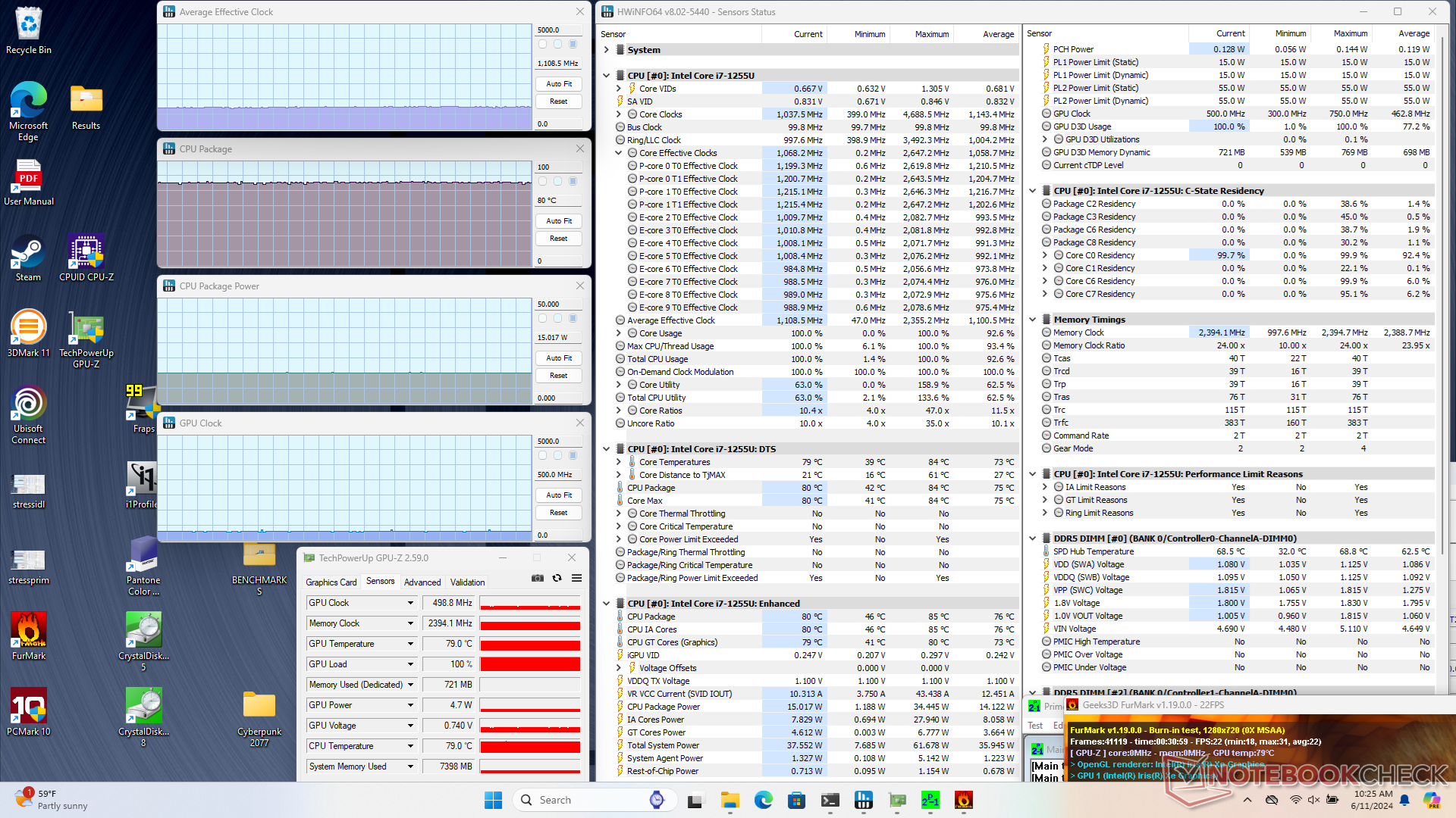 Het totale verbruik bij hogere belastingen is iets lager dan bij de Getac S410 G5 met een snellere Core-P serie CPU. Het maximale stroomverbruik kan tijdelijk oplopen tot 77 W wanneer de CPU zwaar belast wordt, voordat de thermische beperkingen optreden, zoals de grafieken hieronder laten zien. Het systeem is compatibel met de meeste generieke USB-C AC-adapters en dus is de eigen 90 W AC-loopadapter (~15 x 6,4 x 2,6 cm) die in de doos wordt meegeleverd niet absoluut noodzakelijk.