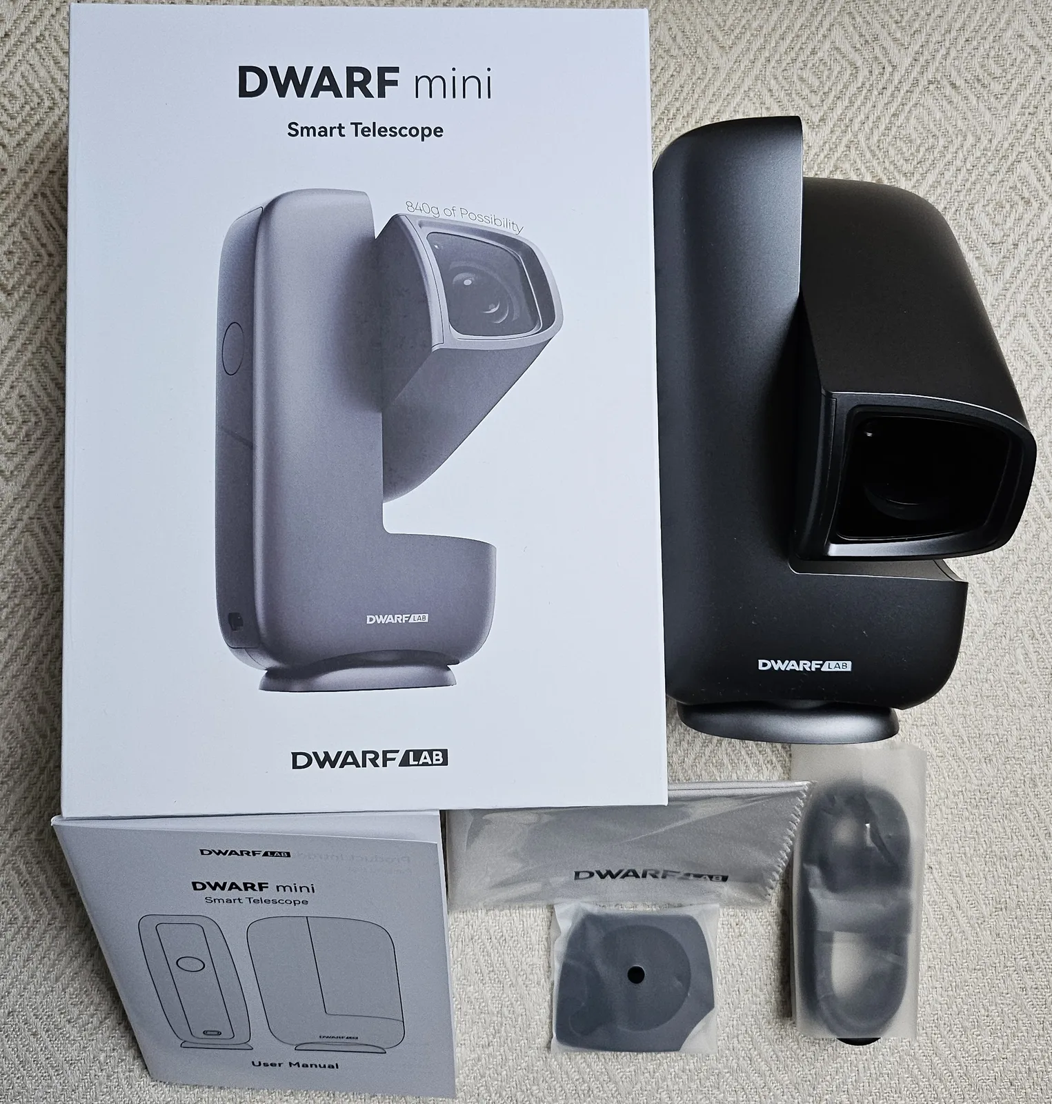 De vrij aantrekkelijke verpakking bevat de telescoop, een USB-C-naar-USB-C kabel voor het opladen van de interne batterij, een magnetisch bevestigbaar zonnefilter, een schoonmaakdoekje en een snelstartgids in zes talen.
