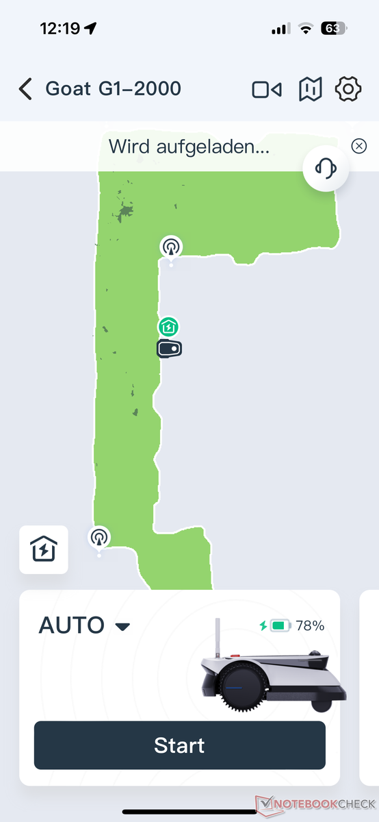 Zoals u misschien al weet van hun robotstofzuigers, voelt de Ecovacs-app voor Android en iOS voor de Goat G1 ook behoorlijk gepolijst aan - en het is niet alleen het instelproces dat indruk maakt. De startpagina van elk geregistreerd apparaat geeft op het eerste gezicht realtime informatie over de huidige status. Wanneer de robotmaaier in werking is, wordt het voltooide gebied in kleur weergegeven op de virtuele kaart en aangegeven in vierkante meters en percentage. Deze functie helpt u om voortdurend de voortgang bij te houden. Hetzelfde geldt voor het batterijniveau, of de maaier nu werkt of wordt opgeladen.