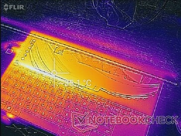 De onderste hotspot kan veel warmer worden dan de bovenste bij meer dan 56 C. Ter vergelijking, de ZenBook 14 UX425EA met dezelfde Core i7-1165G7 CPU zou een piek bereiken bij slechts ongeveer 44 C onder vergelijkbare omstandigheden. De hoger dan gemiddelde CPU-prestaties die hierboven zijn genoteerd, lijken bij een hoger dan gemiddelde oppervlaktetemperatuur te komen.