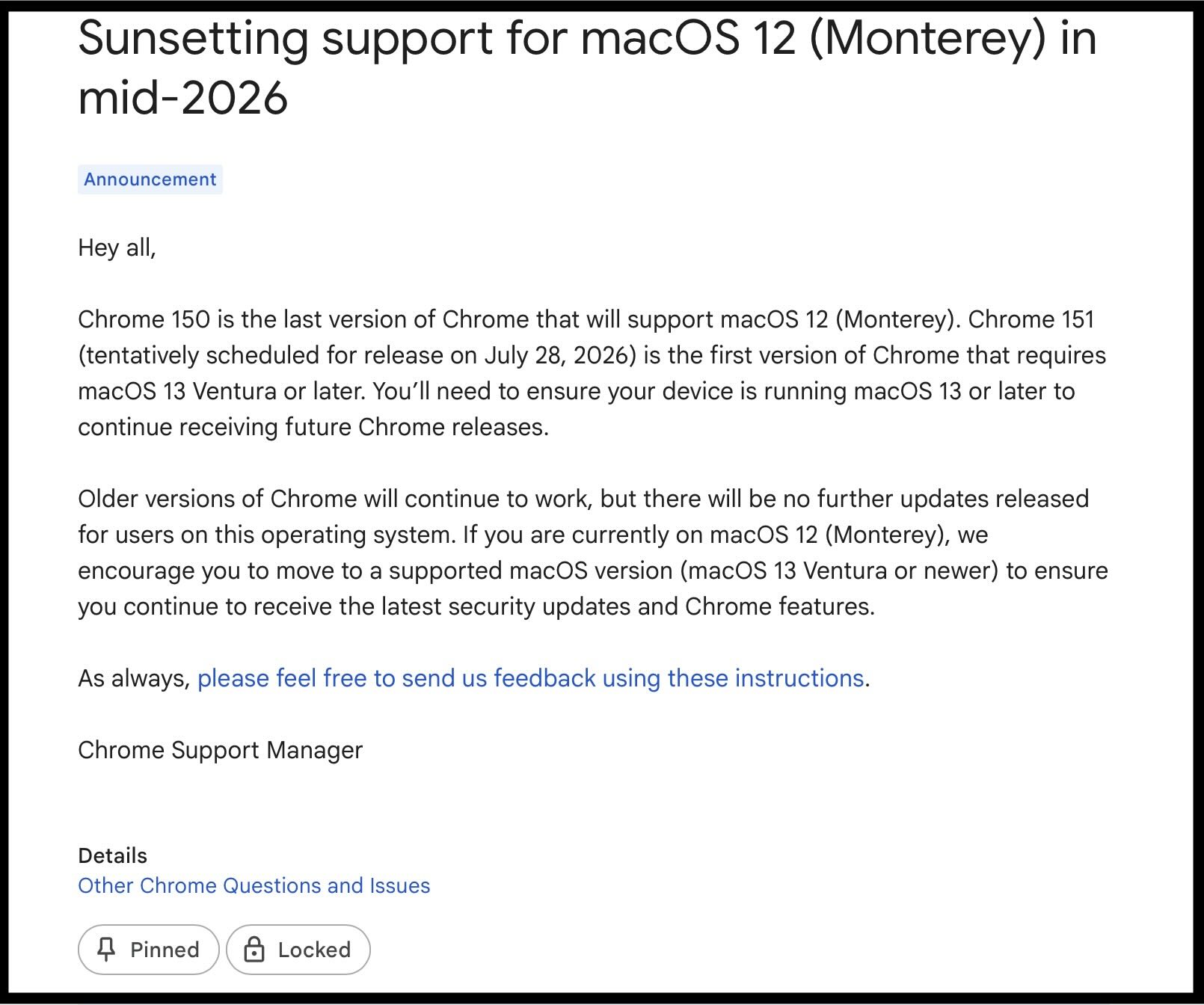 Mensen die Google Chrome gebruiken op hun Macs van voor 2018 krijgen binnenkort te maken met een ongelukkige gebeurtenis. Volgens een recente update op https://support.google.com/chrome/thread/404150391/sunsetting-support-for-macos-12-monterey-in-mid-2026 op Google's officiële ondersteuningspagina voor Chrome, zal Chrome 150 de laatste versie van de populaire webbrowser zijn die macOS 12 Monterey ondersteunt.