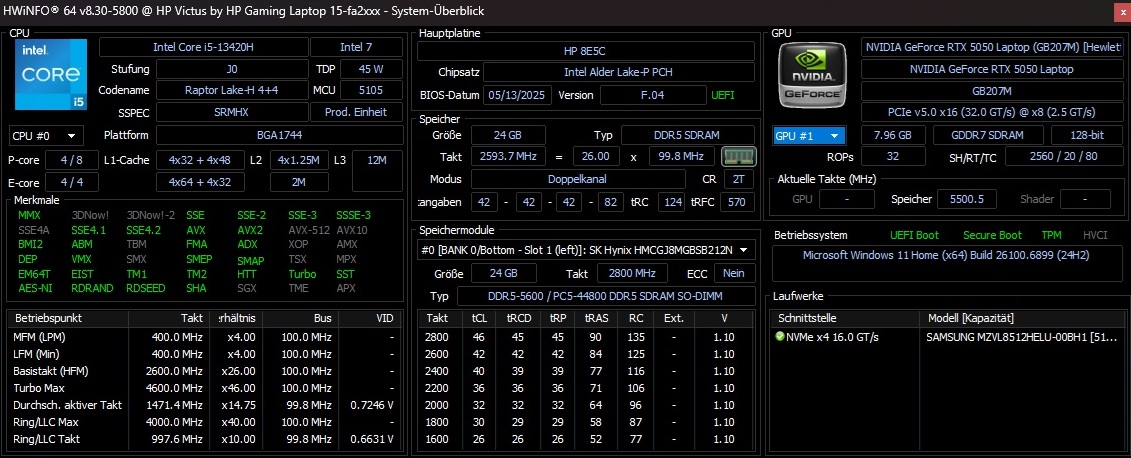 | HP Victus 15-fa2160ng i5-13420H, GeForce RTX 5050 Laptop, 70 Wh | HP Victus 15-fa1057ng i5-13500H, GeForce RTX 4050 Laptop GPU, 70 Wh | Medion Erazer Scout 17 E1 MD62758 Core 5 210H, GeForce RTX 5050 Laptop, 53 Wh | Lenovo LOQ 15AHP10 R7 250, GeForce RTX 5060 Laptop, 60 Wh | HP Omen 16-ap0091ng R9 8940HX, GeForce RTX 5060 Laptop, 70 Wh | Gemiddelde van klas Gaming | |
