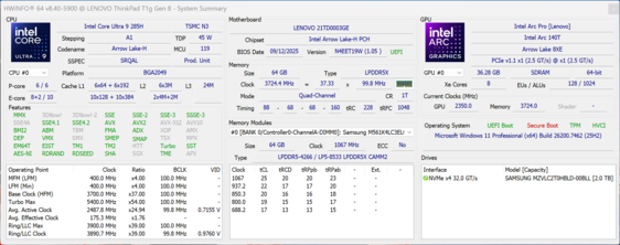 De algemene prestaties van de onderdelen zijn sterk, hoewel de grafische kaart iets sneller had gekund. Onder de concurrenten onderscheidt de ThinkPad T1g Gen 8 zich door het aanbieden van door de gebruiker vervangbaar RAM, twee snelle PCIe 5.0 M.2 slots en Thunderbolt 5 ondersteuning. Daar staat tegenover dat bepaalde bedrijfsgerichte functies, zoals een SmartCard-lezer of een 5G-modem, ontbreken.