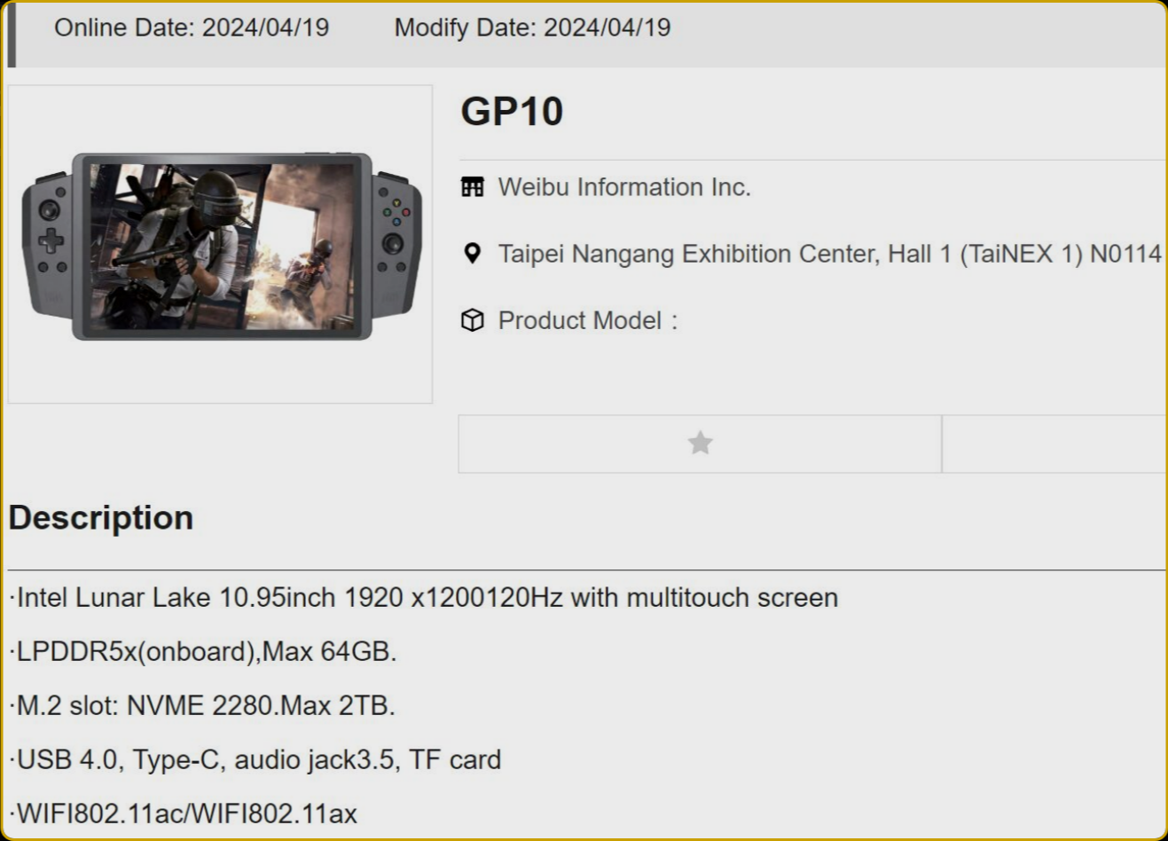 De eerste draagbare consoles met Intel's Core Ultra-processors met geïntegreerde Arc GPU maakten niet echt indruk omdat ze de bestaande AMD Phoenix implementaties konden verslaan. Ondertussen was AMD's Hawk Point en zelfs Strix Point APU's van AMD al gepland voor bepaalde handheld consoles, en Intel zal proberen een alternatief te bieden met de komende Lunar Lake Core Ultra 200V-serie, die naar verwachting dit najaar op de markt komt. Maar misschien hoeven we niet zo lang te wachten om deze in actie te zien, want PCWorld heeft onlangs een Weibu GP10 console gespot op de Computex site (reeds verwijderd), wat suggereert dat deze begin volgende maand in Taipei getoond zou kunnen worden.