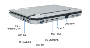 De poortkeuze is degelijk voor een klein apparaat van 720 g, maar de USB-poorten zijn een beetje verouderd. Het wordt geleverd met USB-C 3.0, USB-A 3.0, USB 2.0, mini HDMI, GbE, audio en een microSD-kaartlezer.