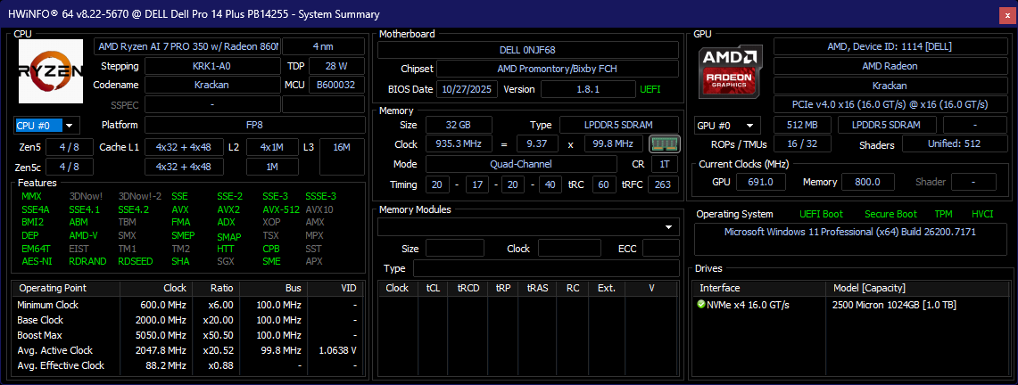 | Dell Pro 14 Plus PB14255 GH77W AMD Ryzen AI 7 PRO 350 ⎘ AMD Radeon 860M ⎘ 32 GB Geheugen, 1024 GB SSD | Catalogusprijs: 1630 Euro | 1.6 kg | 22 mm | 14.00" 1920x1200 162 PPI IPS LED | |