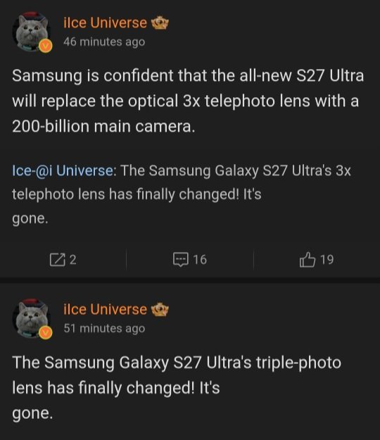 Interessant genoeg komt dit een dag nadat Ice Universe een render van de Galaxy S27 Ultra plaatste en de community om meningen vroeg over het ontwerp. De render had ook drie camera's op de achterkant. Dit doet ons dus denken dat Ice Universe's Galaxy S27 Ultra render meer zou kunnen zijn dan slechts een door een fan gemaakte afbeelding.
