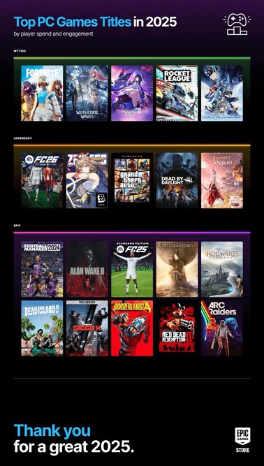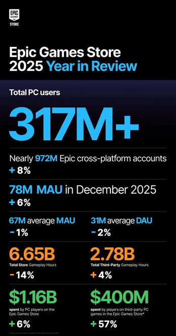 In 2025 wist de Epic Games Store verschillende van zijn eigen records te breken, aangezien het Steam-alternatief vorig jaar 78 miljoen maandelijkse actieve gebruikers registreerde, die in totaal meer dan $400 miljoen uitgaven aan games van derden, Fortnite niet meegerekend. In totaal hebben klanten 2,78 miljard uur besteed aan games van derden, waarvan een groot deel waarschijnlijk te danken is aan de wekelijkse gratis games.