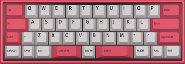 Rechter Alt en de App-toets werden verwisseld, waarbij Rechter Alt dan Fn2 werd, wat gemakkelijke toegang geeft tot de tweede laag, waar we later op in zullen gaan. Hierdoor kunnen we verschillende lagen toewijzen aan veelgebruikte functies of toetsakkoorden en tegelijkertijd de belasting van de hand verminderen door laag 2 met de rechterduim te activeren. Een andere kleine wijziging was het vervangen van de /? toets door een gewoon vraagteken, waardoor het typen van een veelgebruikt leesteken minder moeite kost en / naar laag 1 wordt verplaatst.