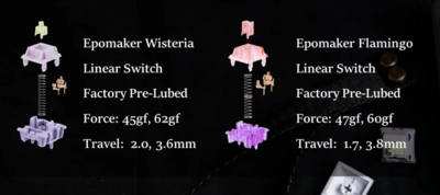 | Default Switch Options | Epomaker Flamingo or Wisteria linear mechanical switches | Layout | 40% semi-custom QWERTY layout with split space bars |