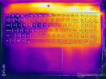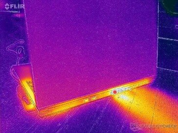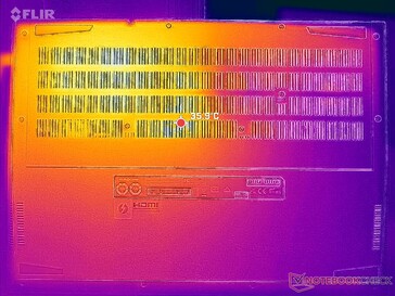 De oppervlaktetemperaturen zijn het warmst aan de rechterhelft van de behuizing, waar hete plekken een aangename 39 C en 50 C kunnen bereiken op respectievelijk het toetsenbord en de onderkant van de behuizing. Deze gebieden bevinden zich gelukkig aan de achterkant, waar het contact met de huid tijdens het gebruik minimaal is.