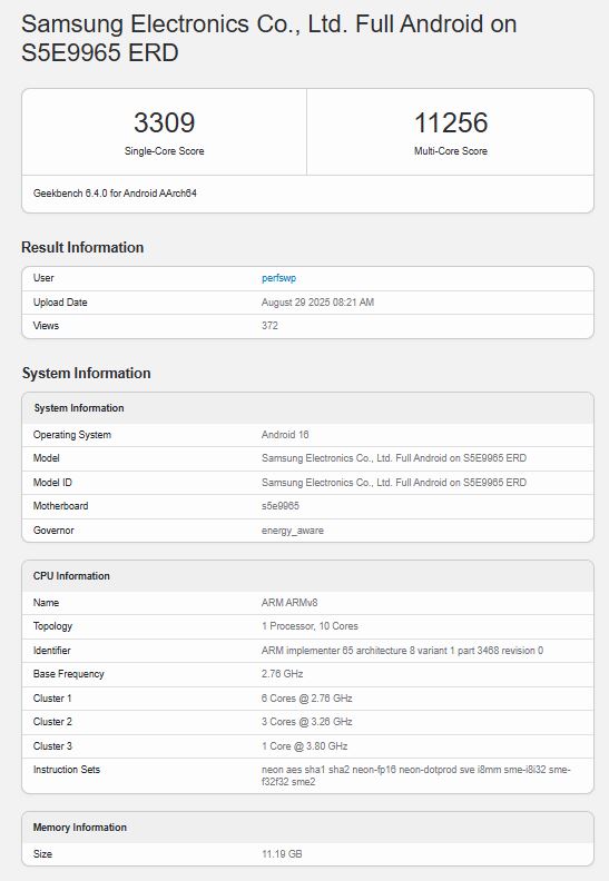De Exynos 2600 staat op Geekbench vermeld als de "S5E9965" en heeft een deca-core opstelling met zes kernen op 2,76 GHz, drie kernen op 3,26 GHz en een primaire kern op 3,80 GHz. Dit zijn allemaal hogere frequenties dan de chipset van het vlaggenschip had toen deze voor het eerst in de benchmark verscheen.