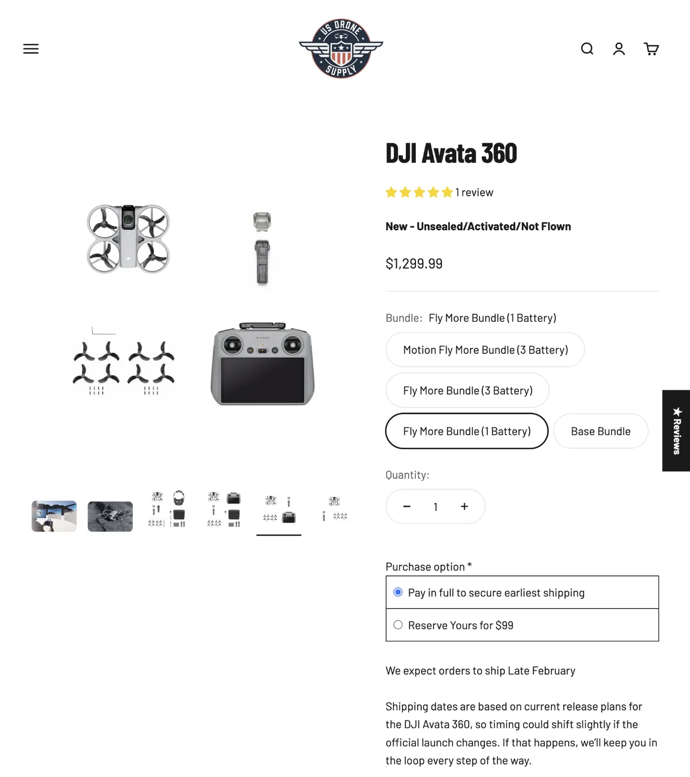 Afgezien daarvan beweert US Drone Supply dat DJI de Avata 360 in vier configuraties zal verkopen. Beginnend met een basisbundel van de drone zelf en een accu voor $999, zal de Avata 360 ook verkrijgbaar zijn in Fly More Bundles met één of drie accu's voor respectievelijk $1.299,99 en $1.799,99. Als alternatief zou de Motion Fly More Bundle een RC 2-controller overslaan voor de Goggles N3.