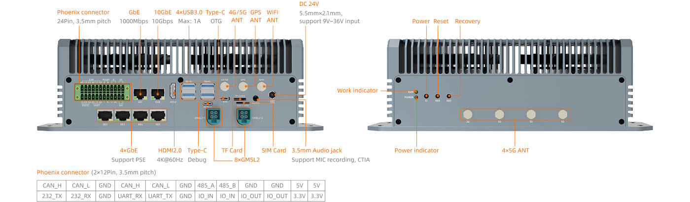 De mini PC, met afmetingen van 277,95 x 136,09 x 88,0 millimeter, wordt geleverd met 64 GB LPDDR5 RAM en eMMC opslag met een capaciteit van 64 GB. Er kan ook een M.2 SSD in M.2 2280 formaat worden geïnstalleerd. Video-uitvoer is mogelijk via HDMI 2.0 of via speciale GMSL2-aansluitingen. Netwerkconnectiviteit is mogelijk via een aantal Ethernetpoorten met 10 Gbps en 5 Gbps. Andere poorten zijn USB 3.0, USB 3.2, Phoenix connectoren, RS485, RS232, CAN 2.0 en UART.