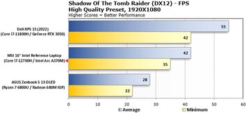 Als het op games aankomt, is de RTX 3050 onverslaanbaar, terwijl Intels Arc A370M niet al te ver achterblijft. De gemiddelde prestaties liggen precies tussen de RTX 3050 en de AMD Radeon 680M iGPU in. Als we echter kijken naar de minimale framerate, vooral bij het inschakelen van ray tracing, zit de Intel chip veel dichter bij de RTX 3050. In dit opzicht verslaat hij deze zelfs met 1 fps in Final Fantasy: Endwalker en ligt slechts een paar fps achter in F1 2021.