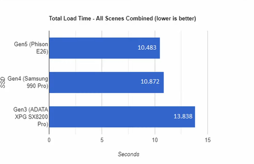 Over het geheel genomen is de PCIe 5.0 SSD met Phison E26 controller alle zeven benchmarkscènes in 10,483 seconden geladen. Vlak daarachter zit de Samsung 990 Pro PCIe 4.0 SSD met 10,872 seconden, terwijl de ADATA XPG SX8200 Pro met PCIe 3.0 controller licht achterblijft met 13,838 seconden. Als het op FPS-tellingen aankomt, is de PCIe 5.0 echter nogal inconsistent. Het biedt aanvankelijk de hoogste framerates voor de eerste paar scènes, maar daarna dalen de FPS niet alleen onder de PCIe 4.0 oplossing, maar ook onder de PCIe 3.0 oplossing naar de laatste scènes toe. Dit is waarschijnlijk een software-optimalisatieprobleem, dat kan worden opgelost met toekomstige game-updates.