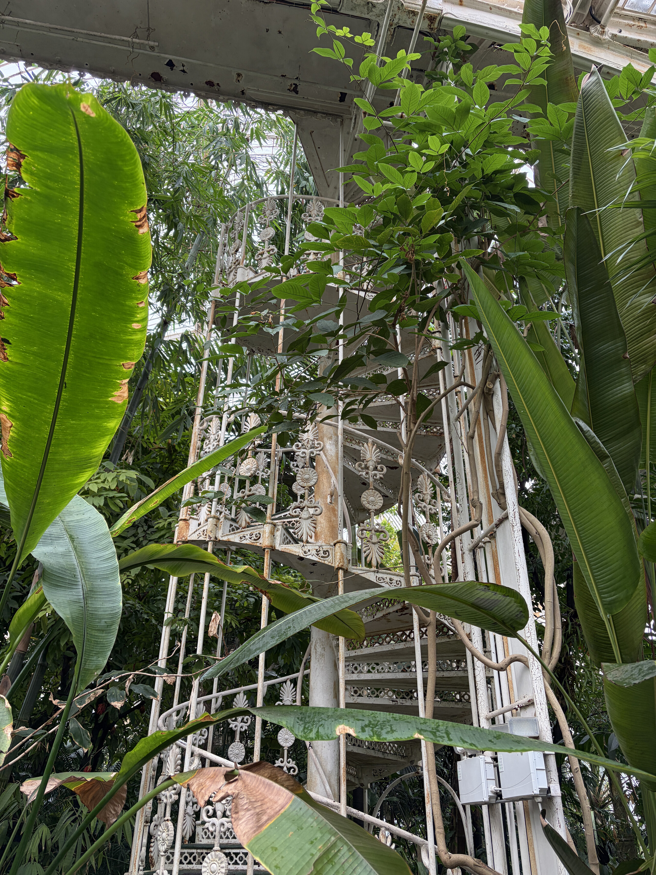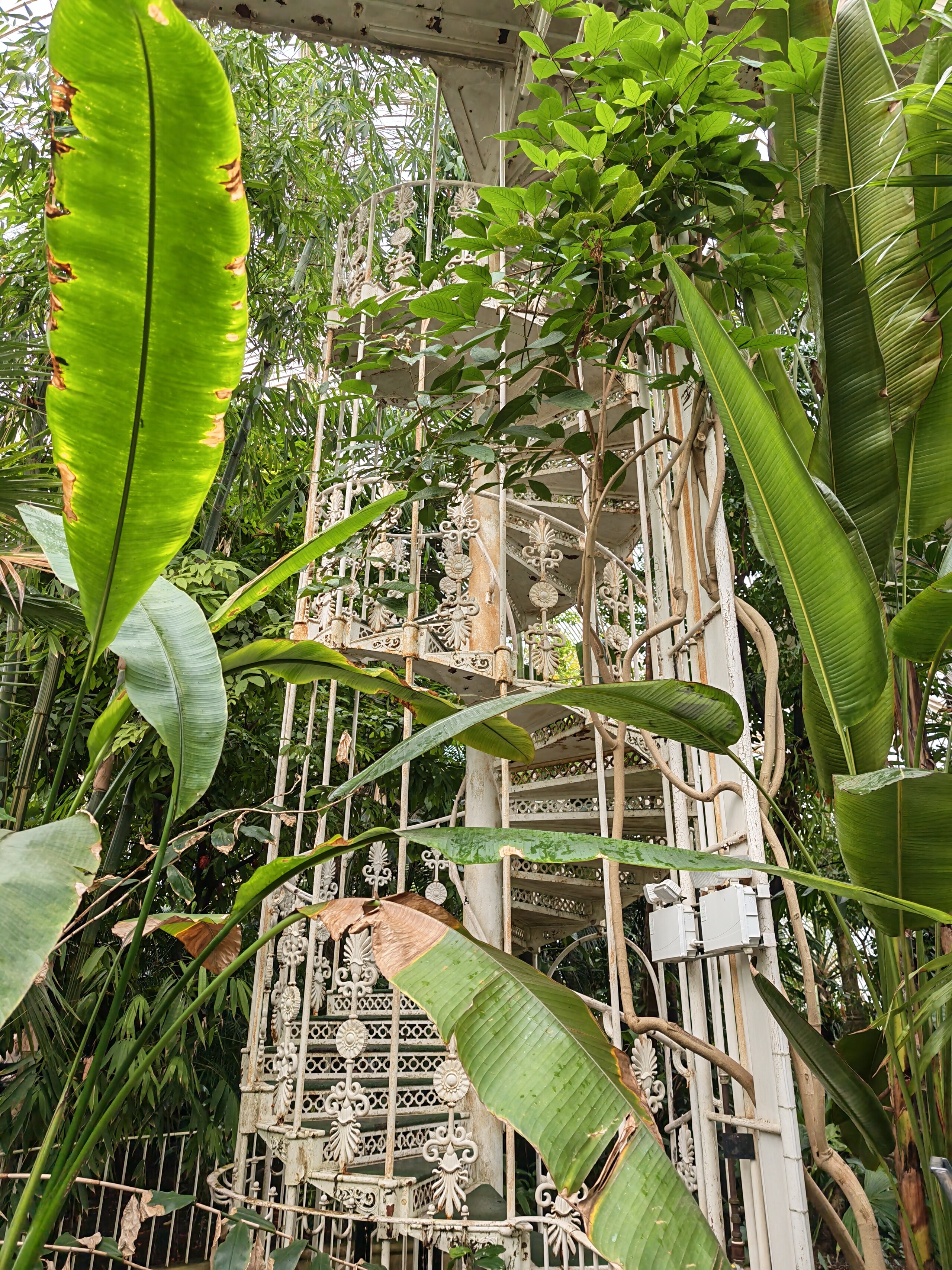 In het Palm House leidt een ijzeren trap ook naar een loopbrug die van bovenaf uitzicht biedt op het weelderige tropische plantenleven. Ook hier ziet de foto van de Honor telefoon er contrastrijker uit, maar de iPhone wint opnieuw op het gebied van detail en scherpte.