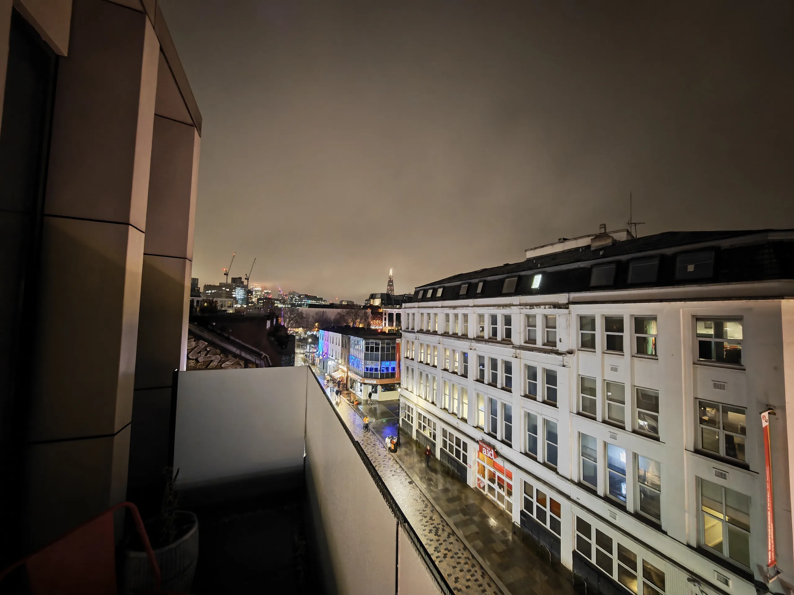 De foto van de straat bij nacht is ook veel minder geslaagd op de iPhone, de verschillende kleuren gaan bijvoorbeeld verloren en de foto ziet er erg troebel uit.