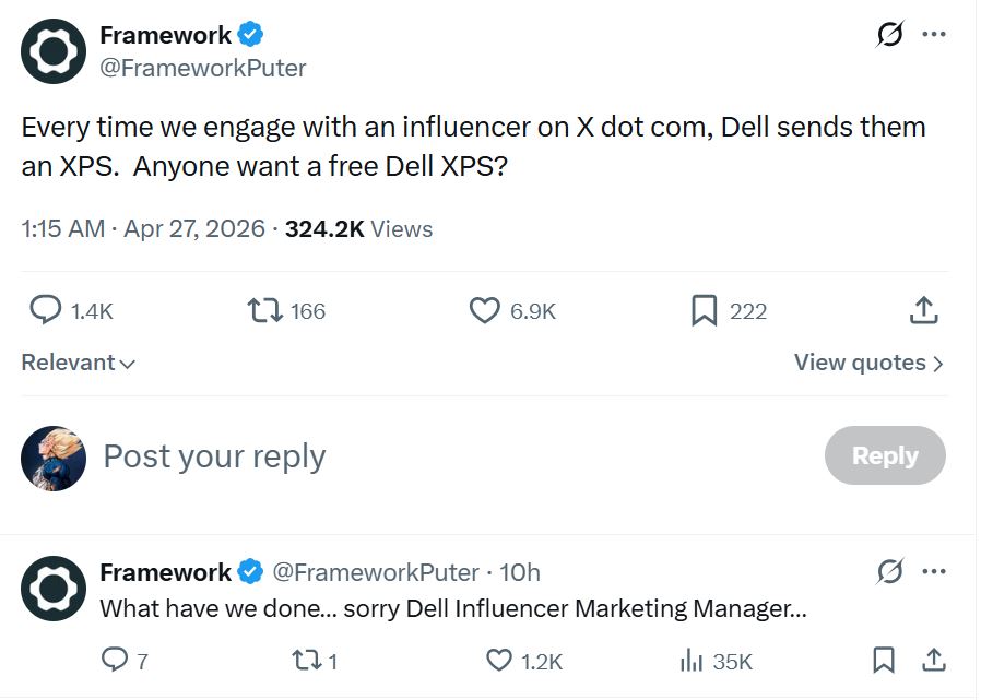 Natuurlijk lijken gevestigde OEM's voor laptops Framework nu serieus te nemen. Framework beweert dat "elke keer dat wij een influencer op X dot com benaderen, Dell hen een XPS stuurt". Het bericht heeft behoorlijk wat verkeer gekregenmet meer dan 320K views op het moment van schrijven. Dit heeft ertoe geleid dat veel mensen gekscherend aan Framework vragen om met hen te communiceren in de hoop een XPS van Dell te krijgen.