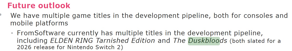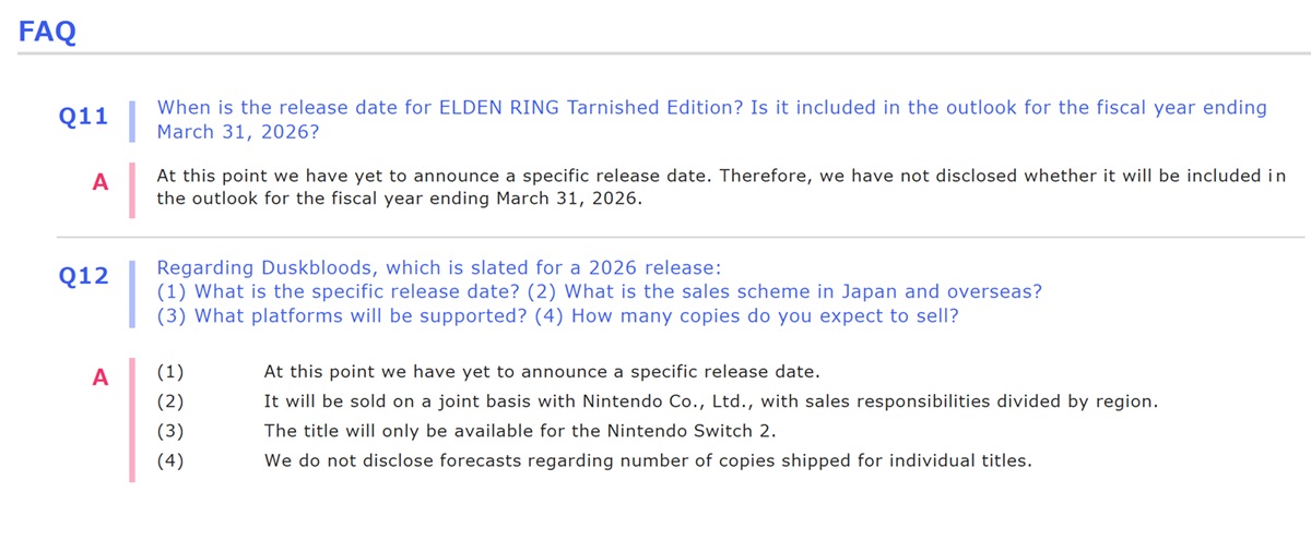 Kadokawa heeft een update opgenomen in haar Q3 Fiscal Year 2026 rapport. Bij het bespreken van de dalende bedrijfswinsten in vergelijking met het voorgaande jaar, werd verwezen naar de Switch 2-spellen. The Duskbloods en Elden Ring Tarnished Edition zijn "beide gepland voor een release in 2026"