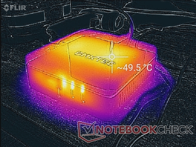 De oppervlaktetemperaturen zijn over het algemeen warmer dan bij de meeste andere mini PC's, aangezien de NucBox 3 geen interne ventilator heeft. Bij hoge belasting gedurende langere periodes, kan de bovenkant tot 50 C warm worden, vergeleken met slechts 30 C op de Beelink GTR5. U zult voorzichtig moeten zijn met voorwerpen of boeken die bovenop de GMK mini PC geplaatst worden.