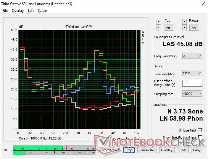 Het ventilatorgeluid is gemengd. Hoewel het systeem over het algemeen stil is wanneer u op het web surft of andere niet veeleisende belastingen uitvoert, neemt het ventilatorgeluid vrij snel toe tot meer dan 40 dB(A) wanneer u intensievere toepassingen uitvoert, zoals games. Bovendien heeft de ventilator hoge tonen, zoals onze scherpe grafiek hieronder laat zien, wat betekent dat elke verandering in toerental beter in het gehoor zal klinken.